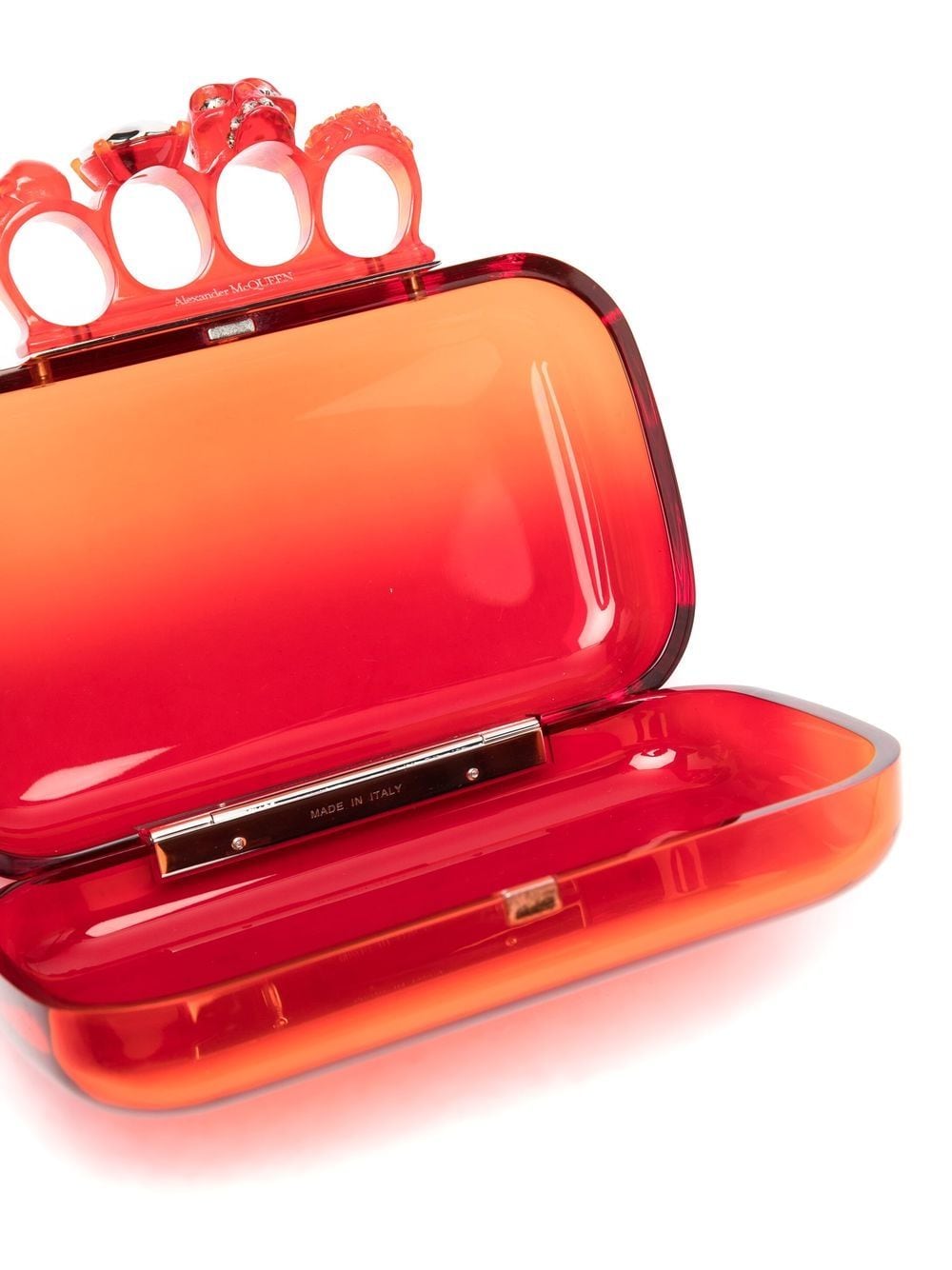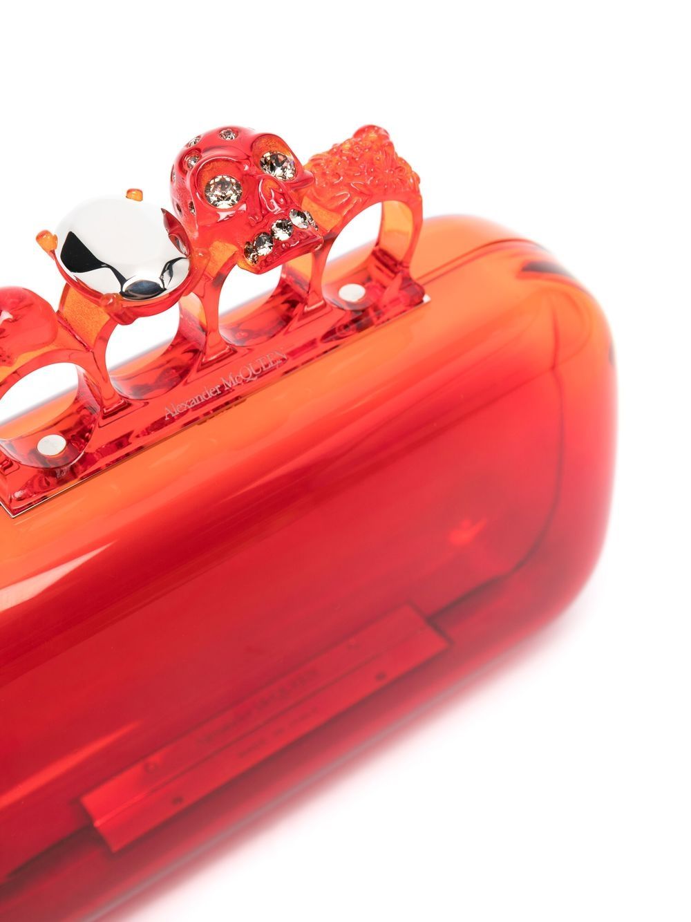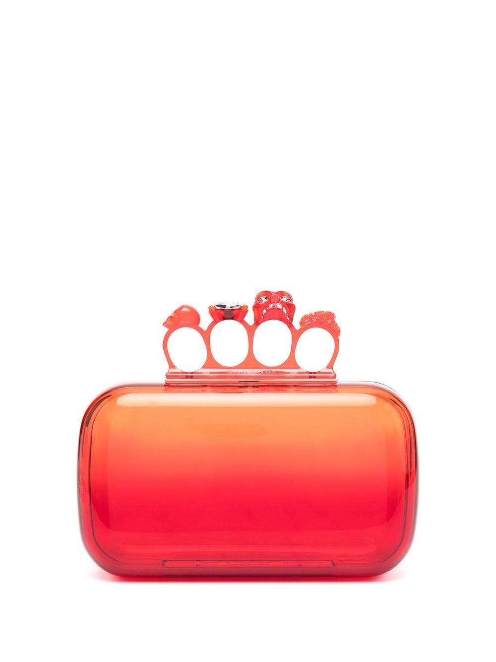 crystal-ring held clutch-bag from Alexander McQueen featuring flame red, crystal embellishment, logo print to the front, rectangle shape, main compartment and four-finger holder.
