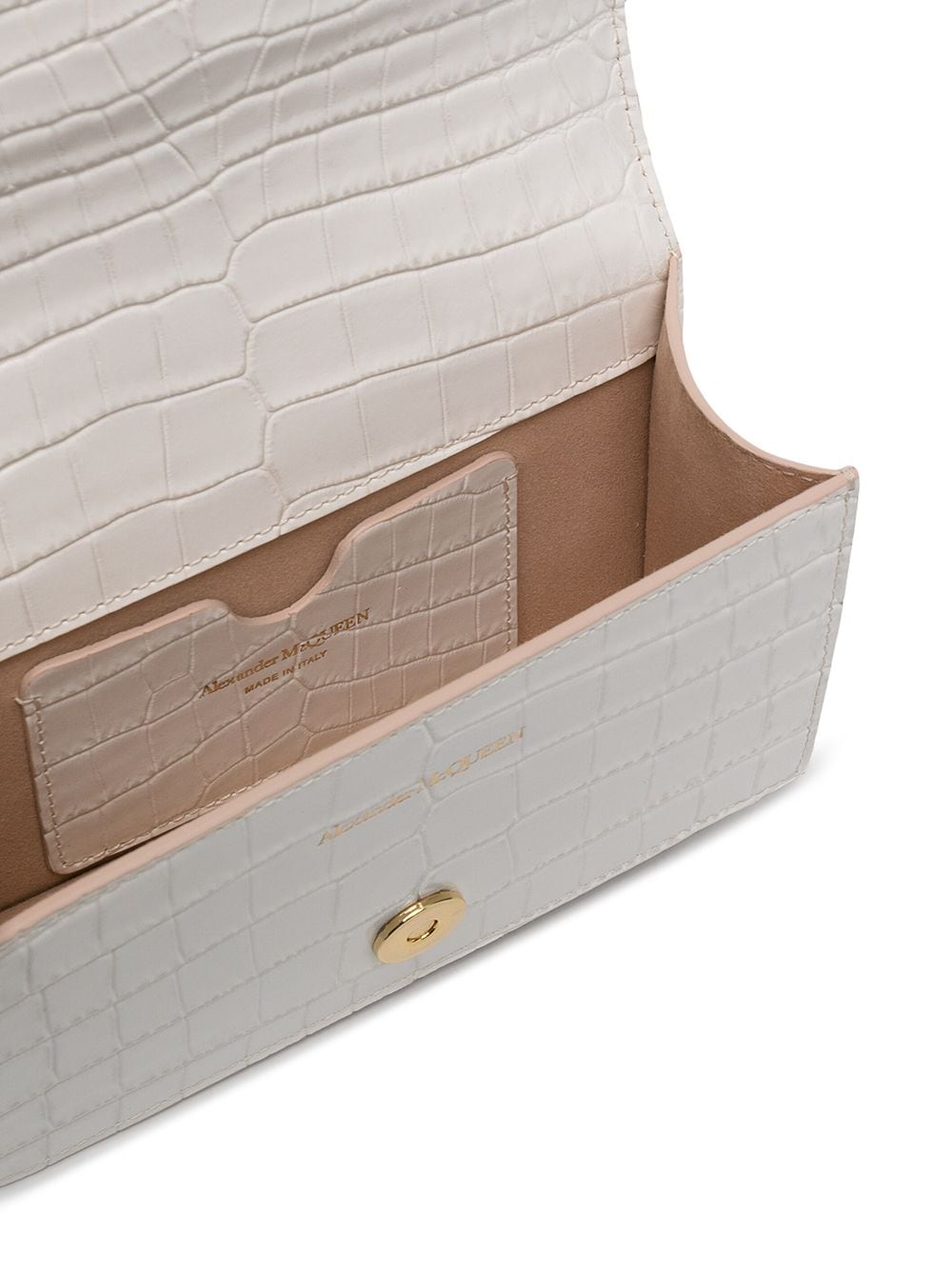 Defiant attitude meets refined elegance. That’s what this small knuckle duster bag is all about, thanks to its crocodile effect and signature Four Ring handle. Only Alexander McQueen can deliver this kind of impact.