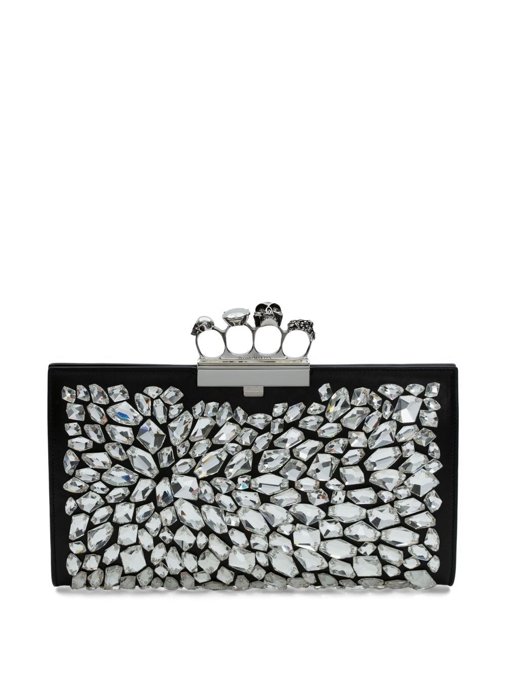 Jewelled Flat crystal-embellished clutch bag from Alexander McQueen featuring black, calf leather, crystal embellishment, skull charm, clasp fastening, signature Four Ring handle, main compartment and internal zip-fastening pockets.