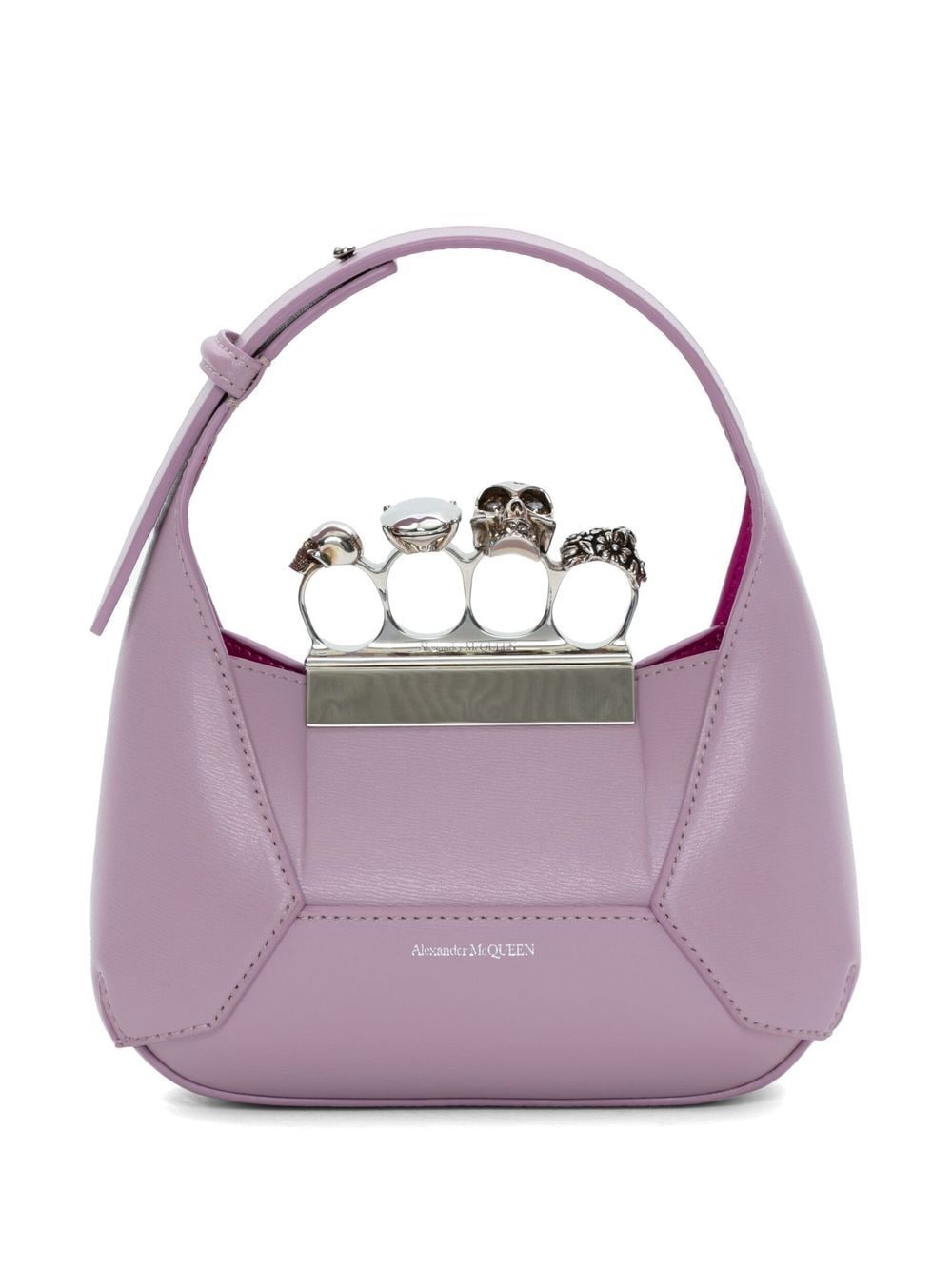 Jewelled Hobo leather mini bag from Alexander McQueen featuring light pink, calf leather, Swarovski crystal embellishment, skull charm, ring embellishment, silver-tone hardware, engraved logo, magnetic fastening, adjustable top handle, detachable chain-link shoulder strap and main compartment.