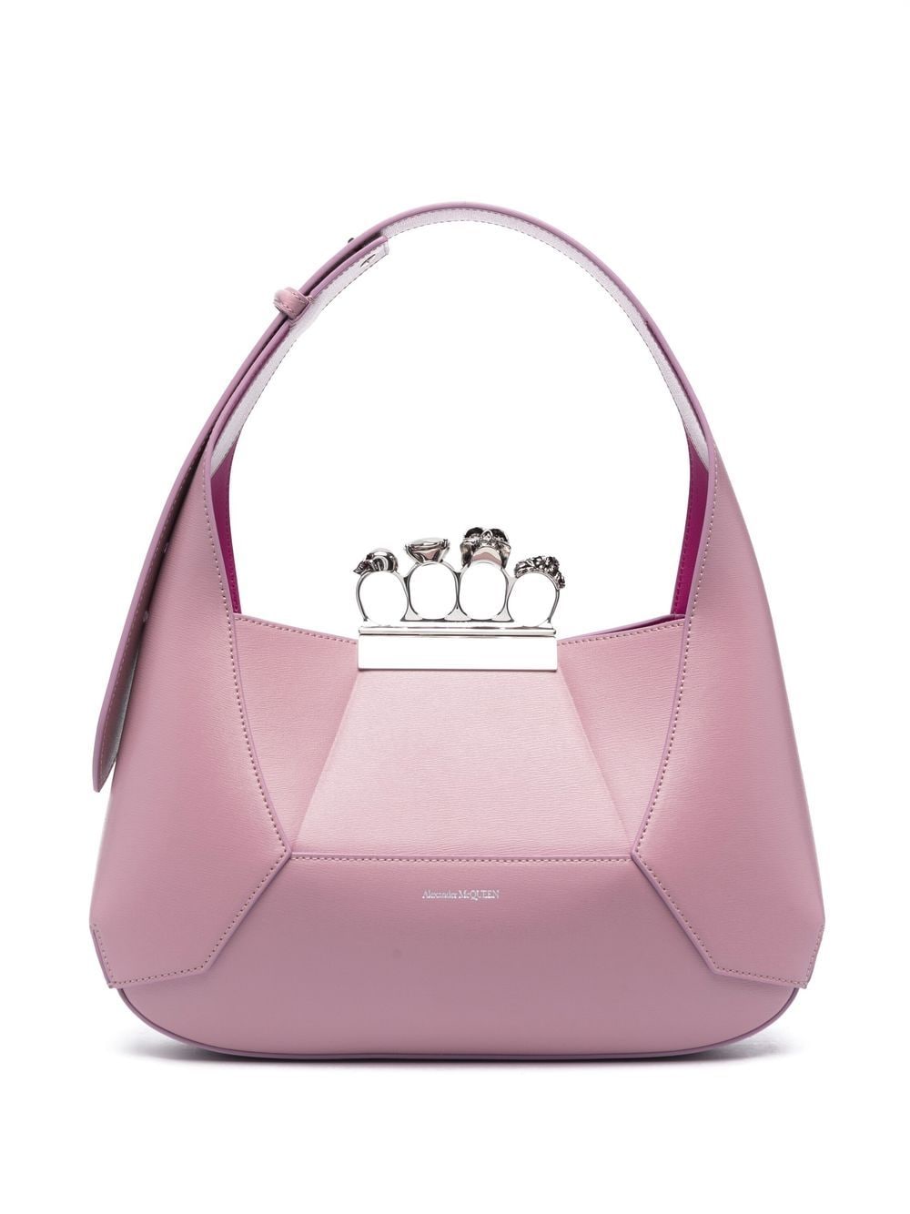 Jewelled Hobo leather tote bag from Alexander McQueen featuring blush pink, calf leather, Swarovski crystal embellishment, skull charm, logo stamp to the front, silver-tone hardware, magnetic fastening, signature Four Ring handle, adjustable top handle and removable pouch.