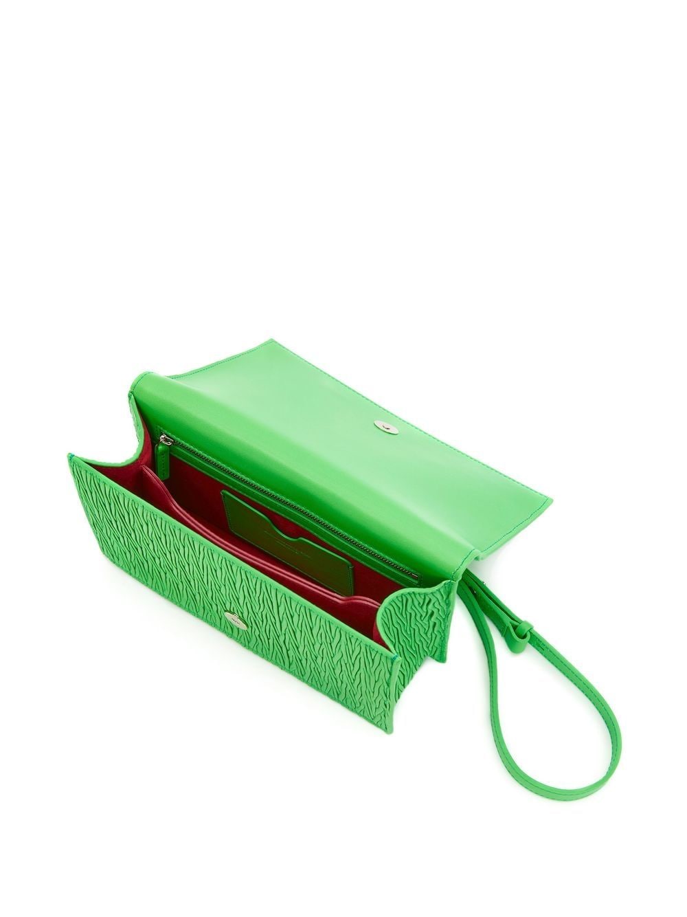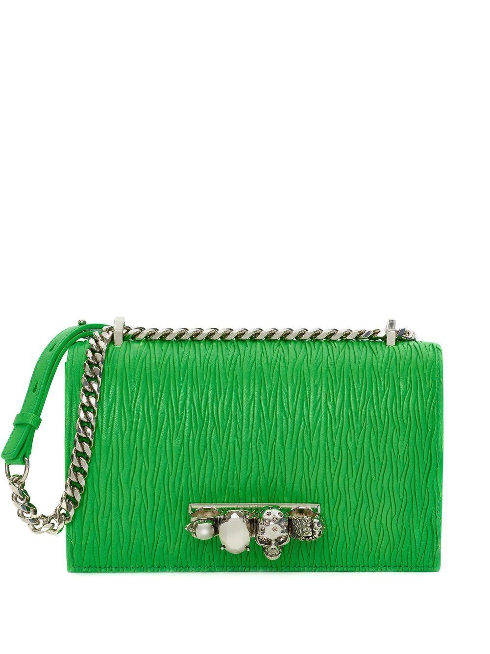 jewelled lambskin satchel bag from Alexander McQueen featuring bright green, lambskin, textured finish, crystal embellishment, foldover top and chain-link shoulder strap.