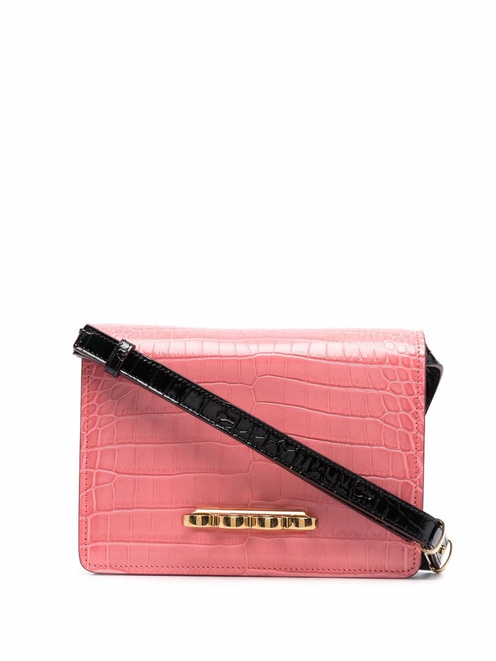 Pink leather knuckle-duster crossbody bag from Alexander McQueen featuring embossed crocodile effect, two-tone design, gold-tone hardware, detachable shoulder strap, foldover top with magnetic fastening, internal slip pocket and internal zip pocket.
