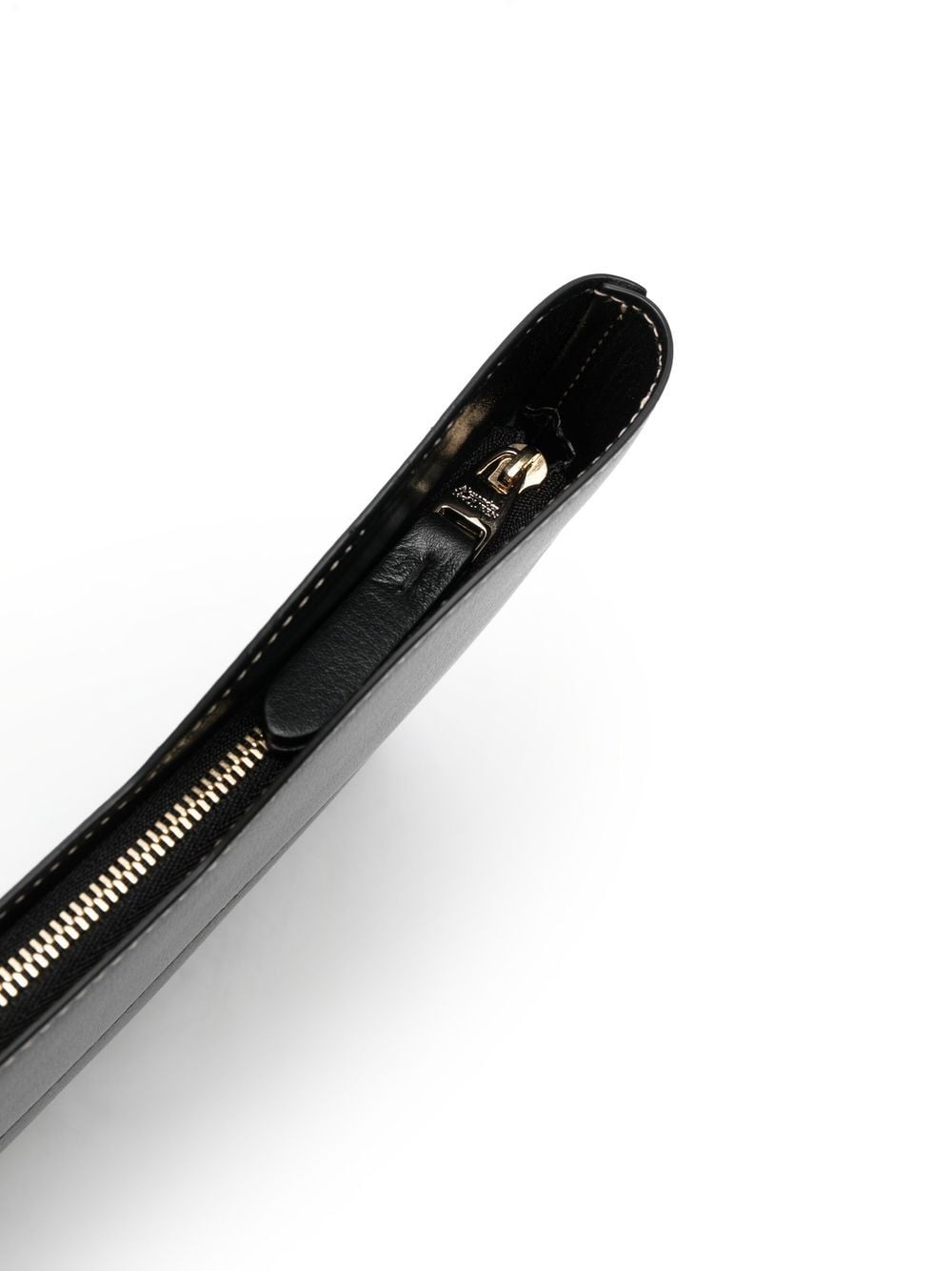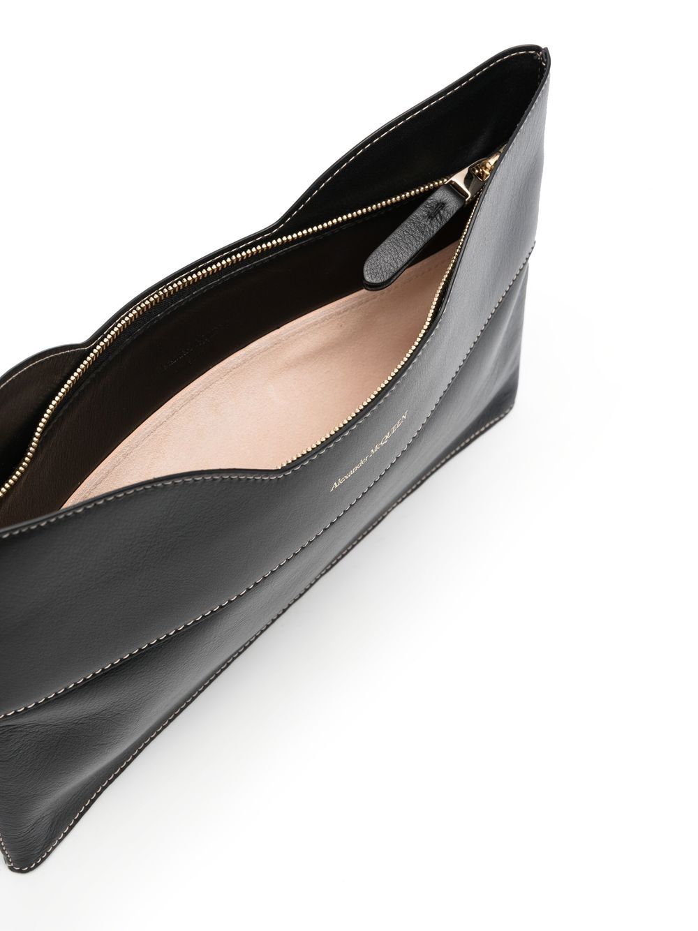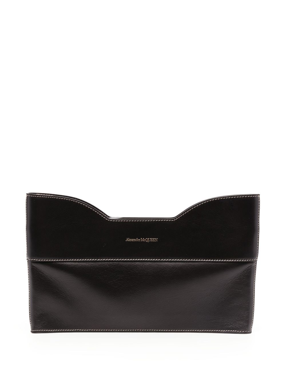 leather clutch bag from Alexander McQueen featuring black, calf leather, logo print to the front, contrast stitching and top zip fastening.