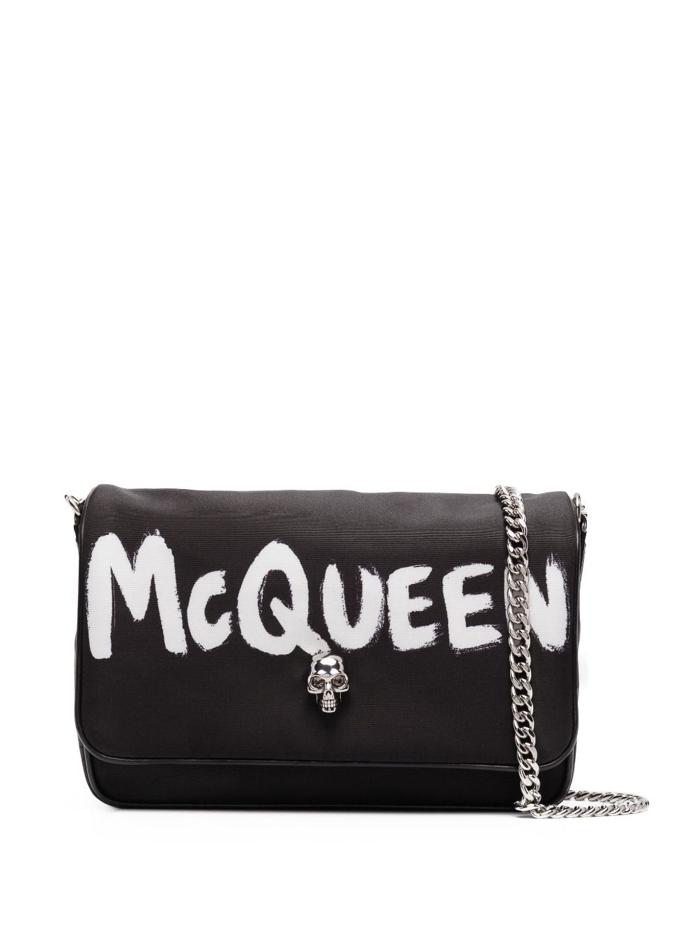 Alexander McQueen’s crossbody bag features two enduring brand signature. This all-black style is punctuated with a logo-graffiti print in contrasting white letters and a skull stud – the motif first featured as part of the founder’s graduate collection in 1992.