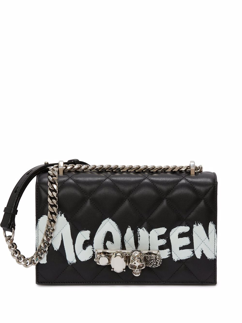 For AW21, Alexander McQueen offers a plethora of graffiti-emblazoned accessories including this crossbody bag. Designed from quilted calf leather, this bag boasts logo lettering in a contrasting hue as well as a skull charm, a long-standing icon of the label.