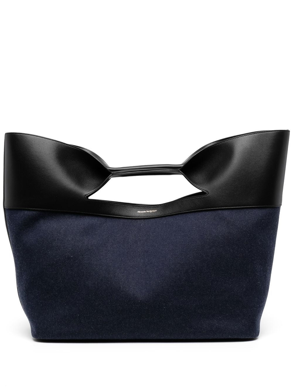 logo-print tote bag from Alexander McQueen featuring two-tone design, silver-tone logo lettering, two rounded top handles, main compartment, concealed press-stud fastening, internal zip pocket, detachable coin purse, denim/black and cotton/leather .