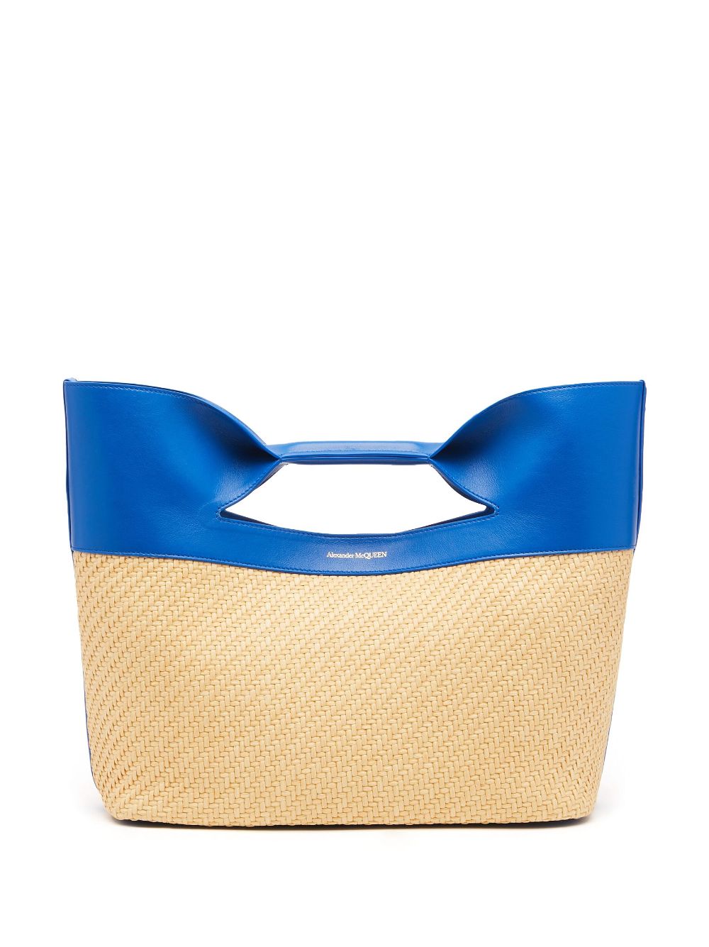 Nodding to the oversized bows adorning Alexander McQueen’s latest collection, this tote bag is named for its shape. It’s crafted from double lined natural raffia and blue smooth calf leather and stamped with the label’s signature logo.
