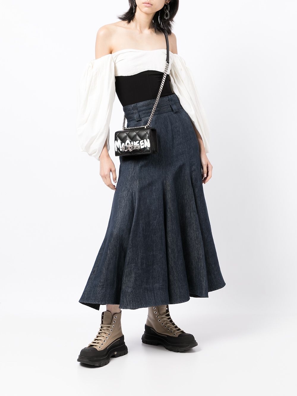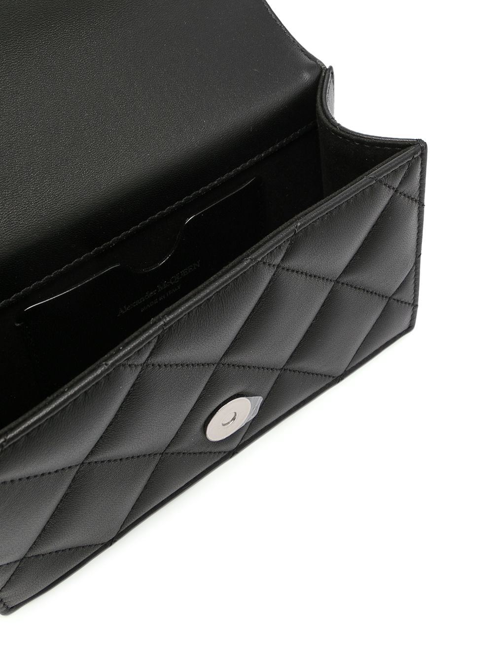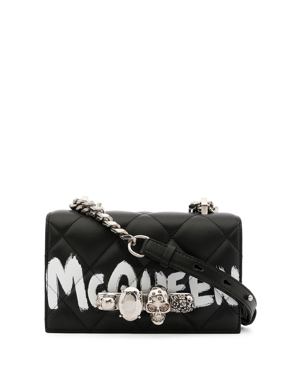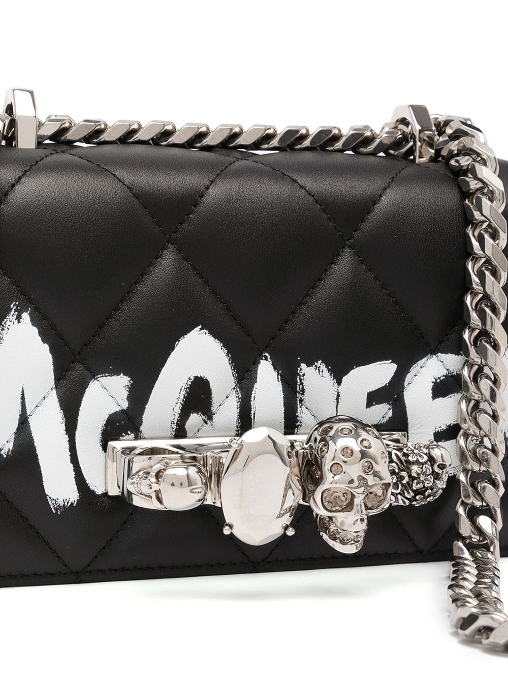 Black leather mini jewelled satchel bag from Alexander McQueen featuring logo print to the front, crystal embellishment, quilted finish, chain-link shoulder strap and foldover top with magnetic fastening.