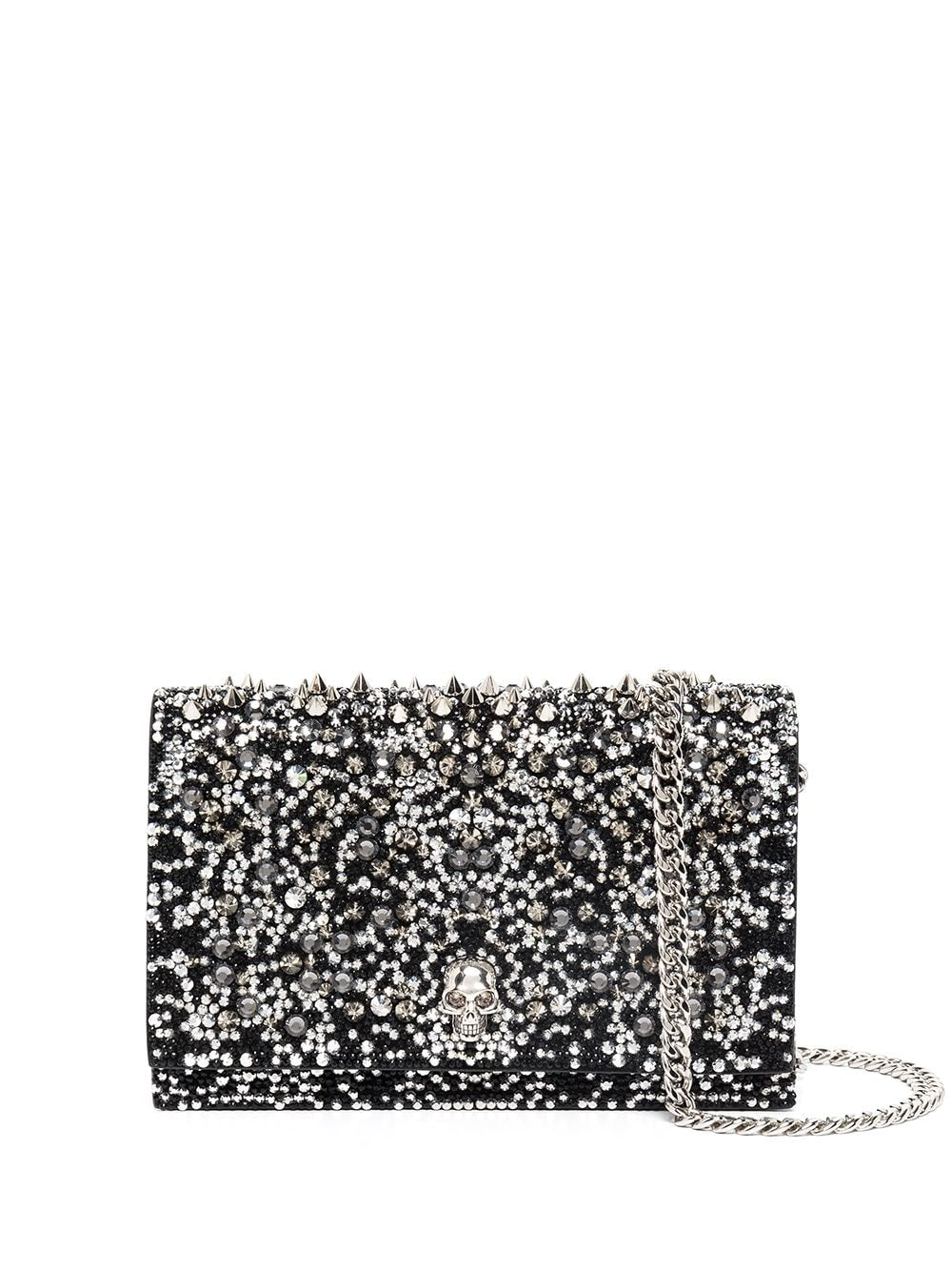 skull-detail mini bag from Alexander McQueen featuring skull stud detailing, stud detailing, adjustable shoulder strap, front flap closure, main compartment, black, leather and metal.