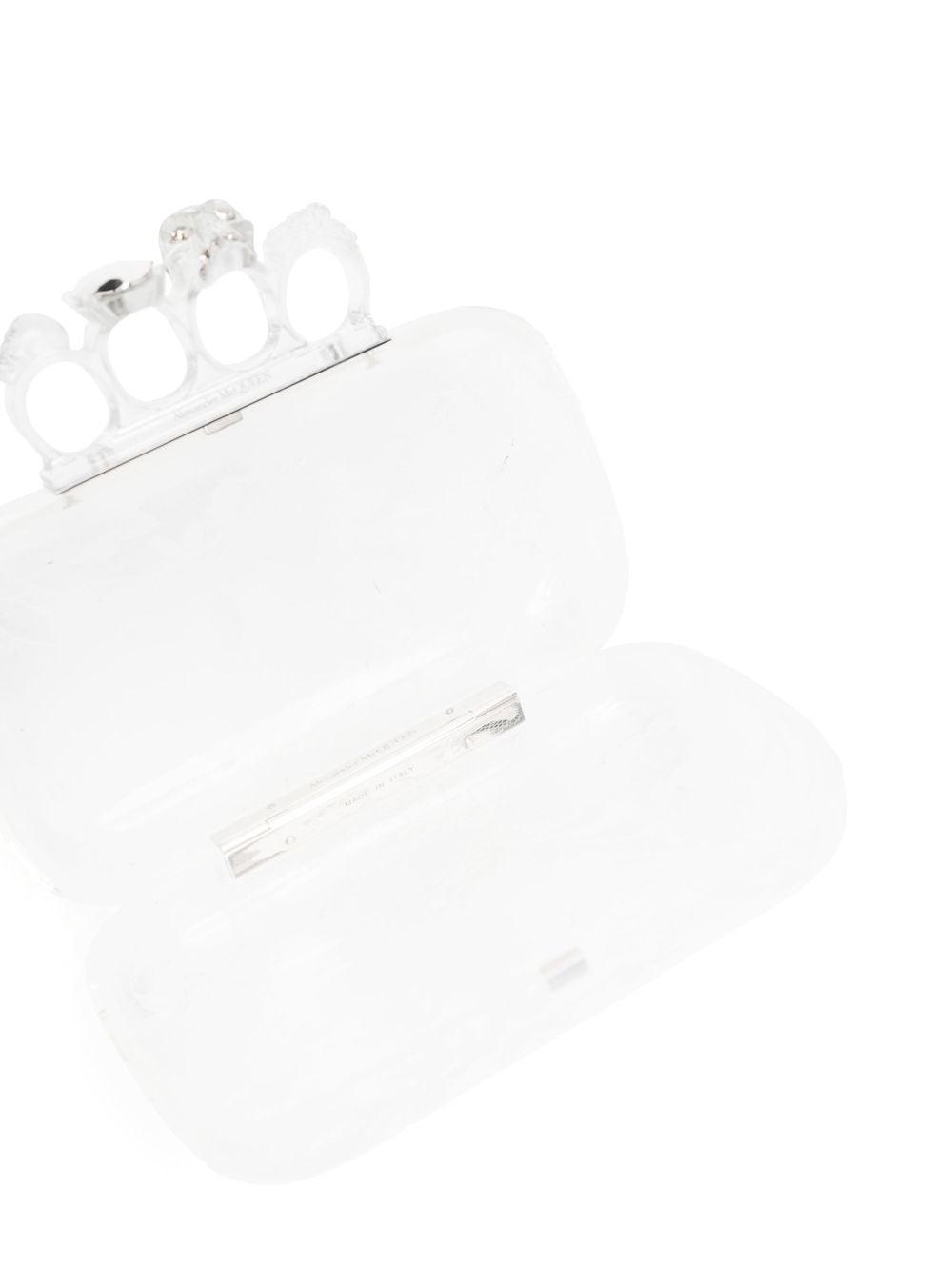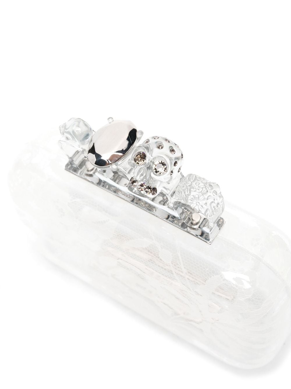 Skull Four-Ring clutch from Alexander McQueen featuring transparent design, silver-tone hardware, skull stud embellishment, knuckleduster design, clasp fastening, main compartment and white.