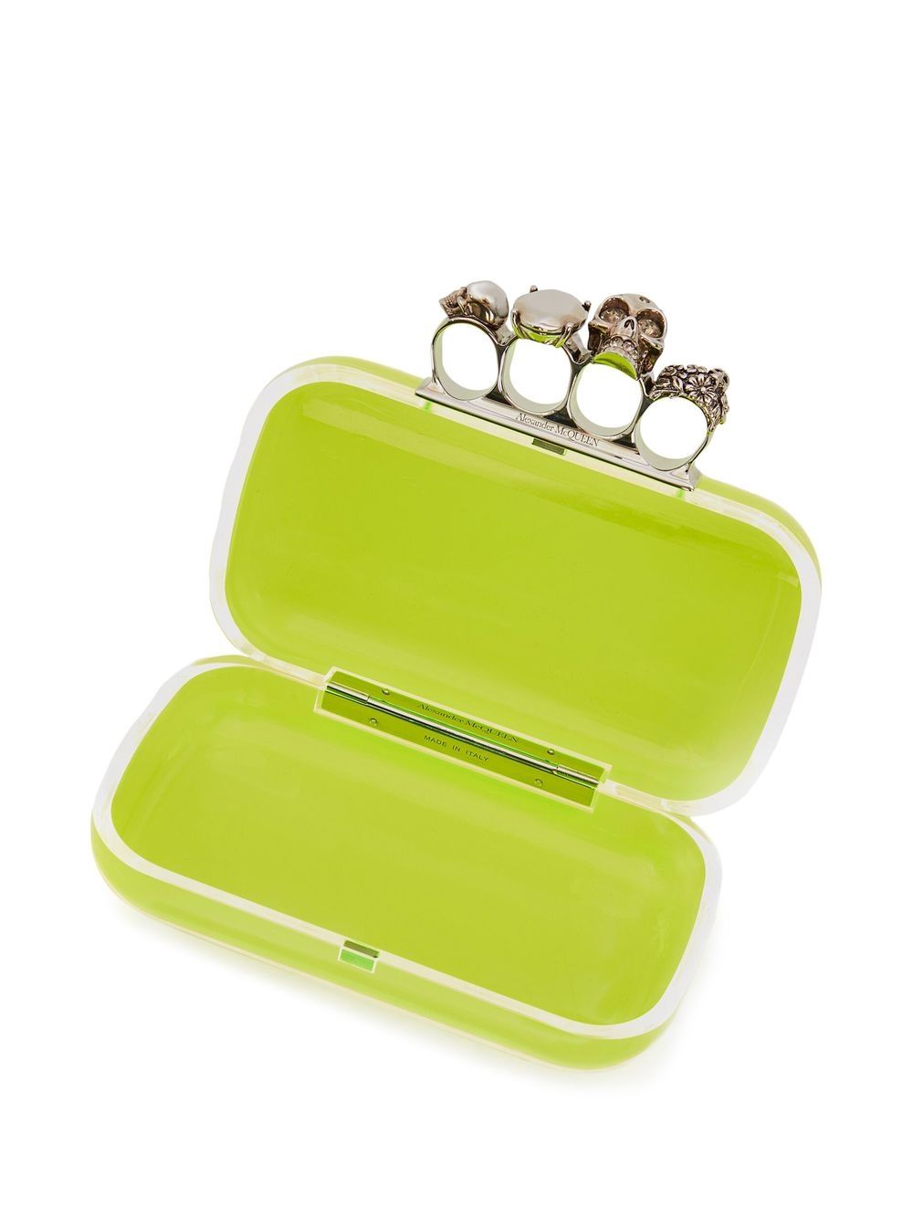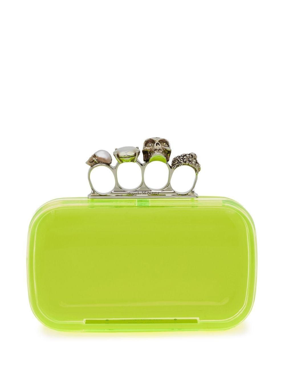 Skull knuckle-duster clutch bag from Alexander McQueen featuring knuckleduster design, skull stud detailing, high-shine finish, acid yellow and hinged.
