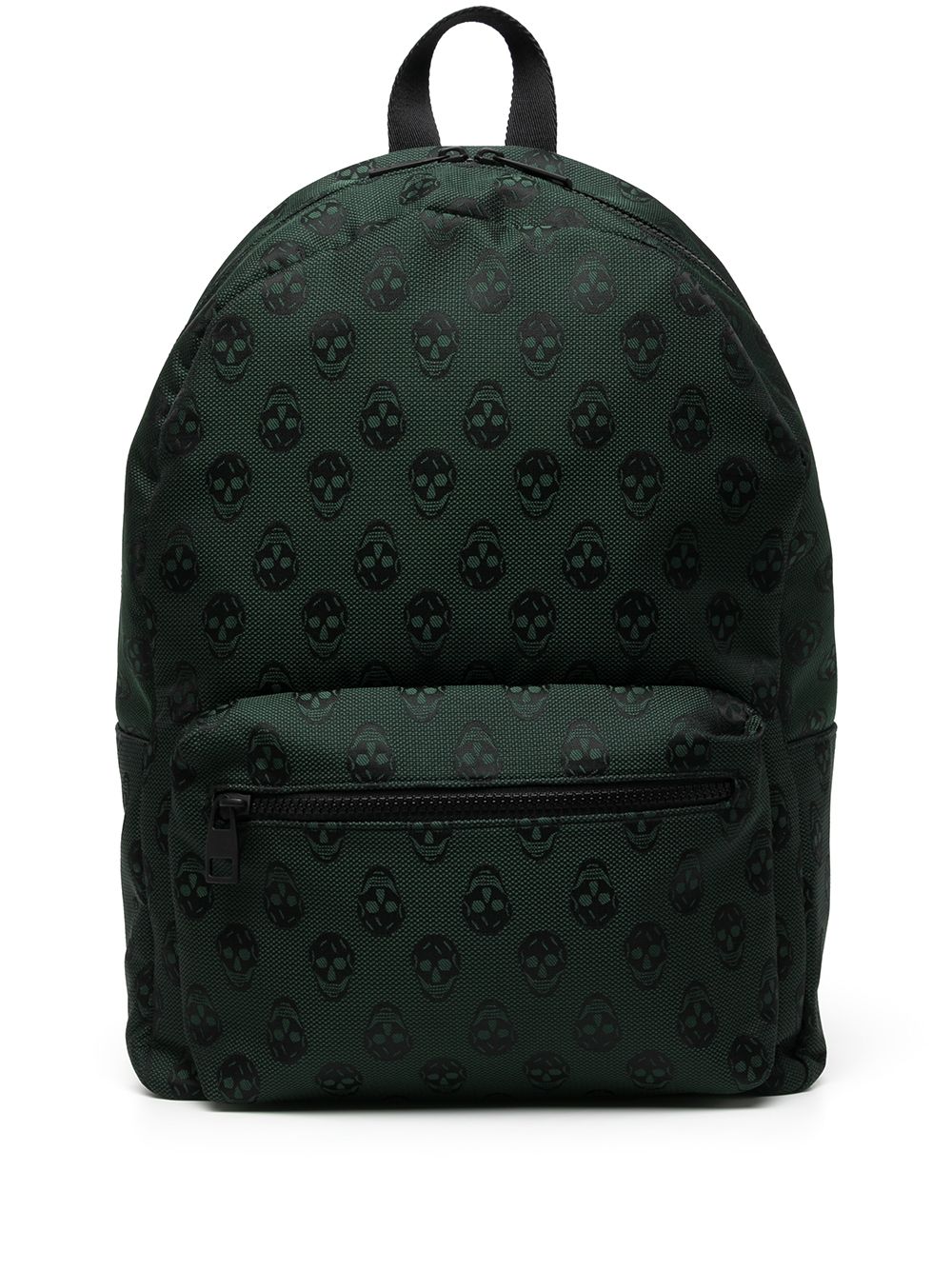 Green/black skull-print backpack from Alexander McQueen featuring skull print, top zip fastening, main compartment, multiple internal slip pockets, front zip-fastening pouch pocket, single rounded top handle and two adjustable shoulder straps.