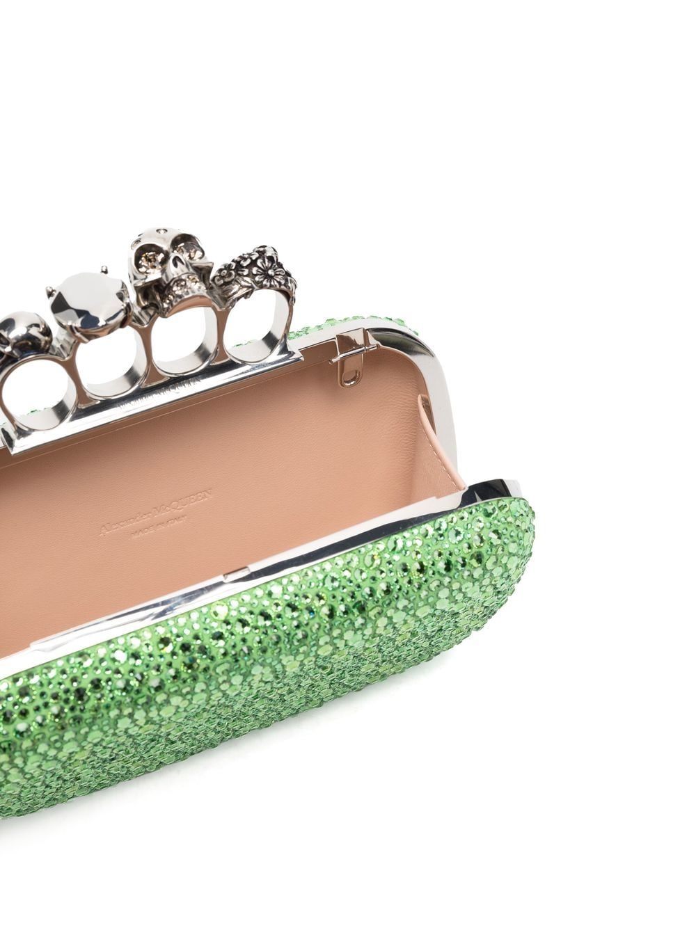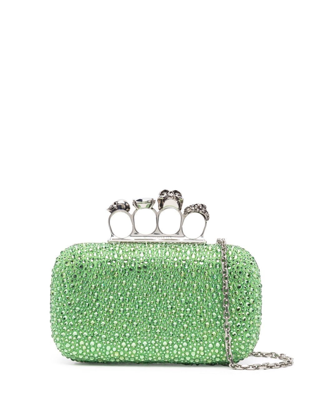 Skull rhinestone-embellished crossbody bag from Alexander McQueen featuring grass green, calf leather, rhinestone embellishment, skull appliqué, clasp fastening, chain-link shoulder strap and main compartment.