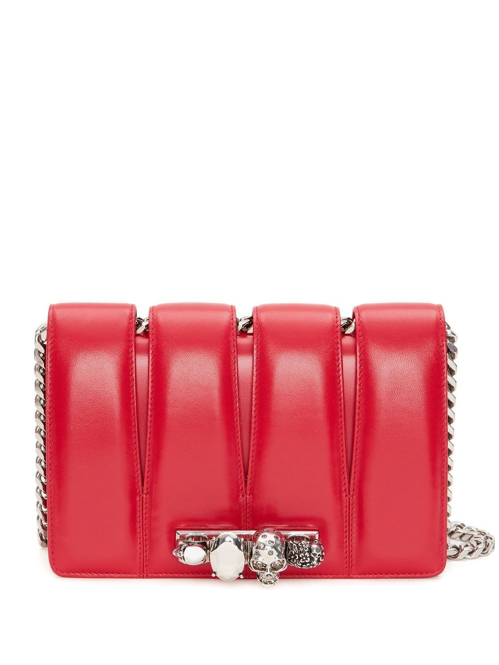 Slash leather shoulder bag from Alexander McQueen featuring scarlet, calf leather, lambskin, cut-out detailing, skull charm, silver-tone hardware, Swarovski crystal embellishment, foldover top with press-stud fastening, chain-link shoulder strap, signature Four Ring handle, main compartment and internal slip pocket.