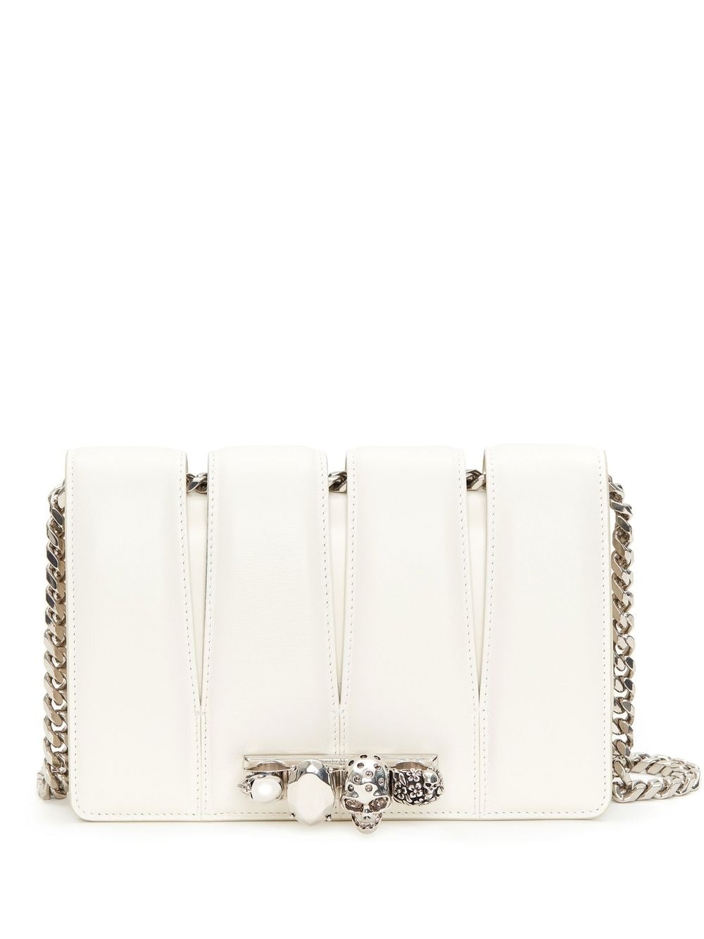 Slash stud-detailing chain-link bag from Alexander McQueen featuring ivory white, calf leather, skull stud detailing, stud detailing, cut-out detailing, chain-link shoulder strap and main compartment.