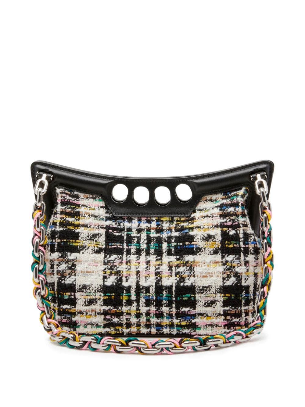 Inspired by the sharp and structured shoulders of tailoring silhouettes, Alexander McQueen updates the Peak shoulder bag with a tweed construction for AW23. The accessory has a curved shape and it can be worn in two different ways: over the shoulder using its antique silver-tone chain strap or hand-held by the four-ring handle.