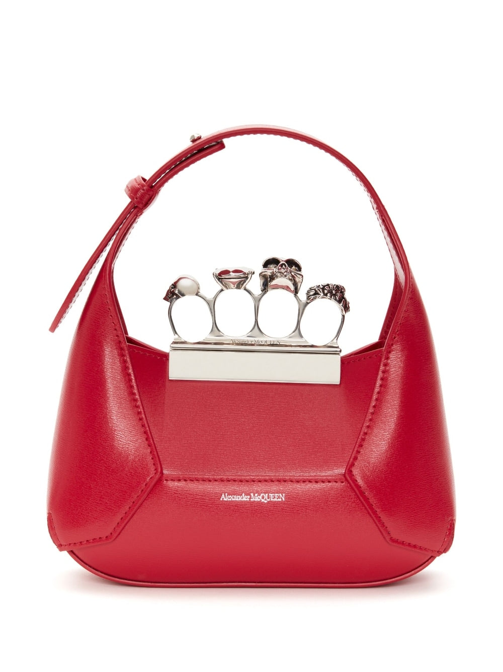 Alexander McQueen introduces the iconic The Jewelled bag: a geometric silhouette crafted from carefully hand-cut leather panels that are strategically reassembled, here in a mini iteration. At the top, the signature Four Ring handle boats Swarovski-encrusted skulls and studs for a distinguished finish.