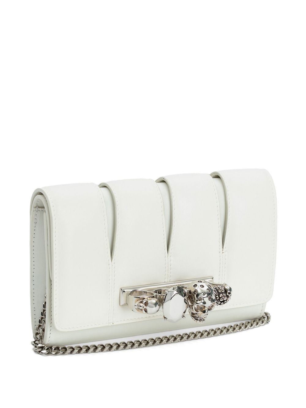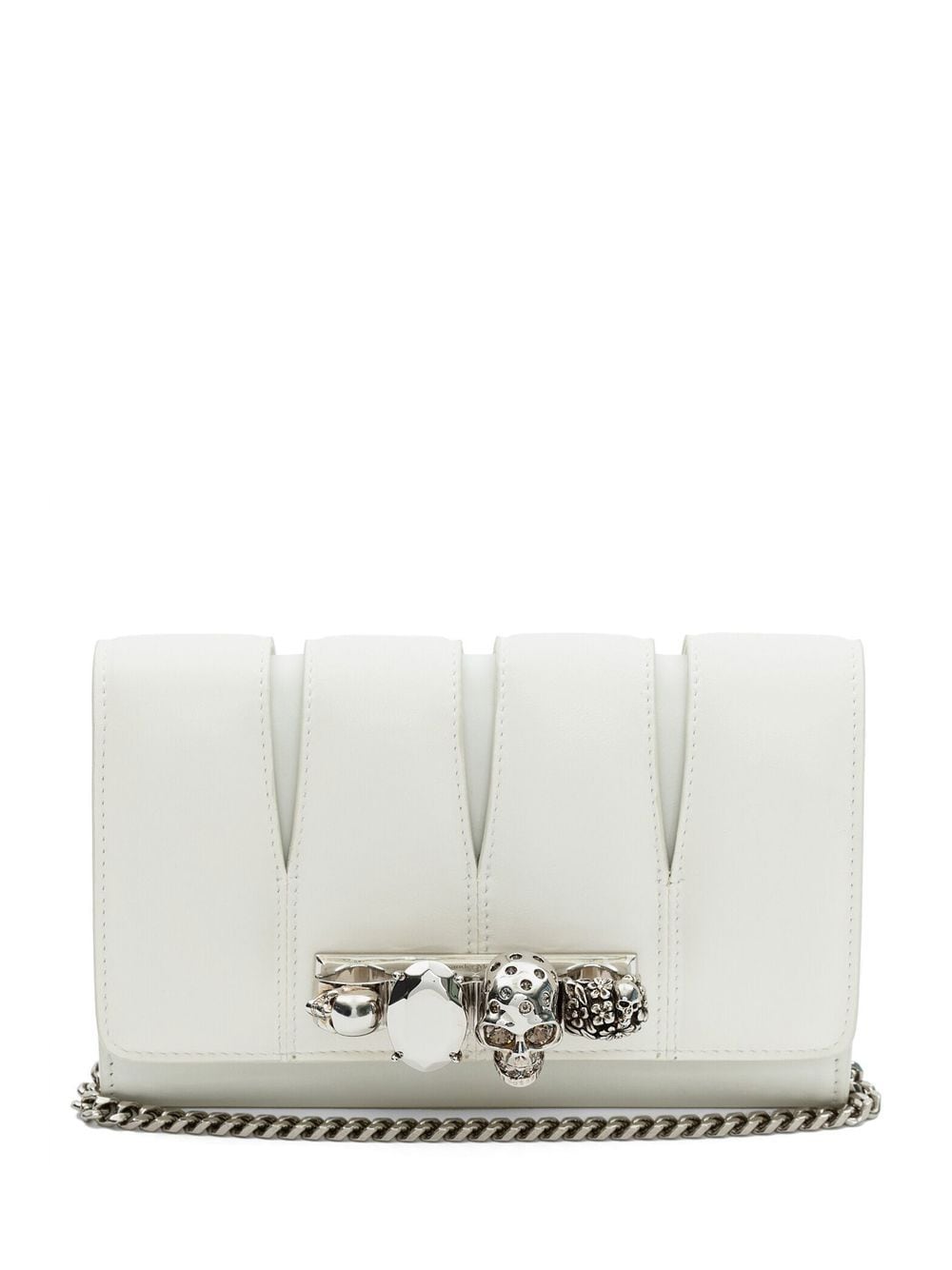 The Slash leather crossbody bag from Alexander McQueen featuring ivory white, calf leather, lambskin, ring embellishment, skull appliqué, foldover top, snap-fit fastening, chain-link shoulder strap, main compartment and internal slip pocket.