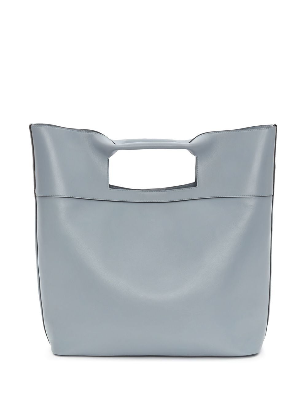 light grey calf leather/suede engraved logo two rounded handles to the sides main compartment