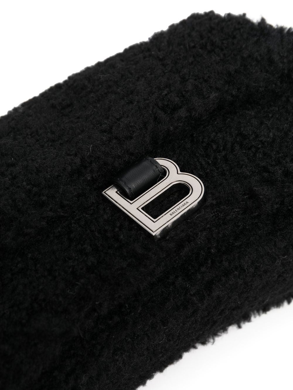 Balenciaga’s Crush bag is defined by its curved shape. This iteration is characterised by a furry bouclé finish and complemented by the iconic silver-tone ‘B’ logo plaque to the front of this black-hued design.