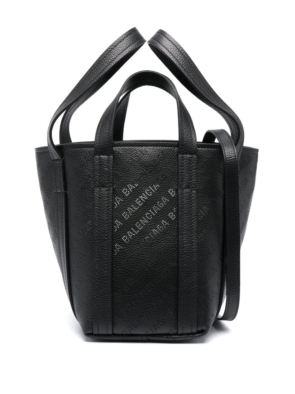 Balenciaga adopts a subtle approach to its logomania themes in the Everyday XS North-South tote bag. It’s crafted from grained black leather to a compact silhouette and decorated at each side with perforated logo lettering.