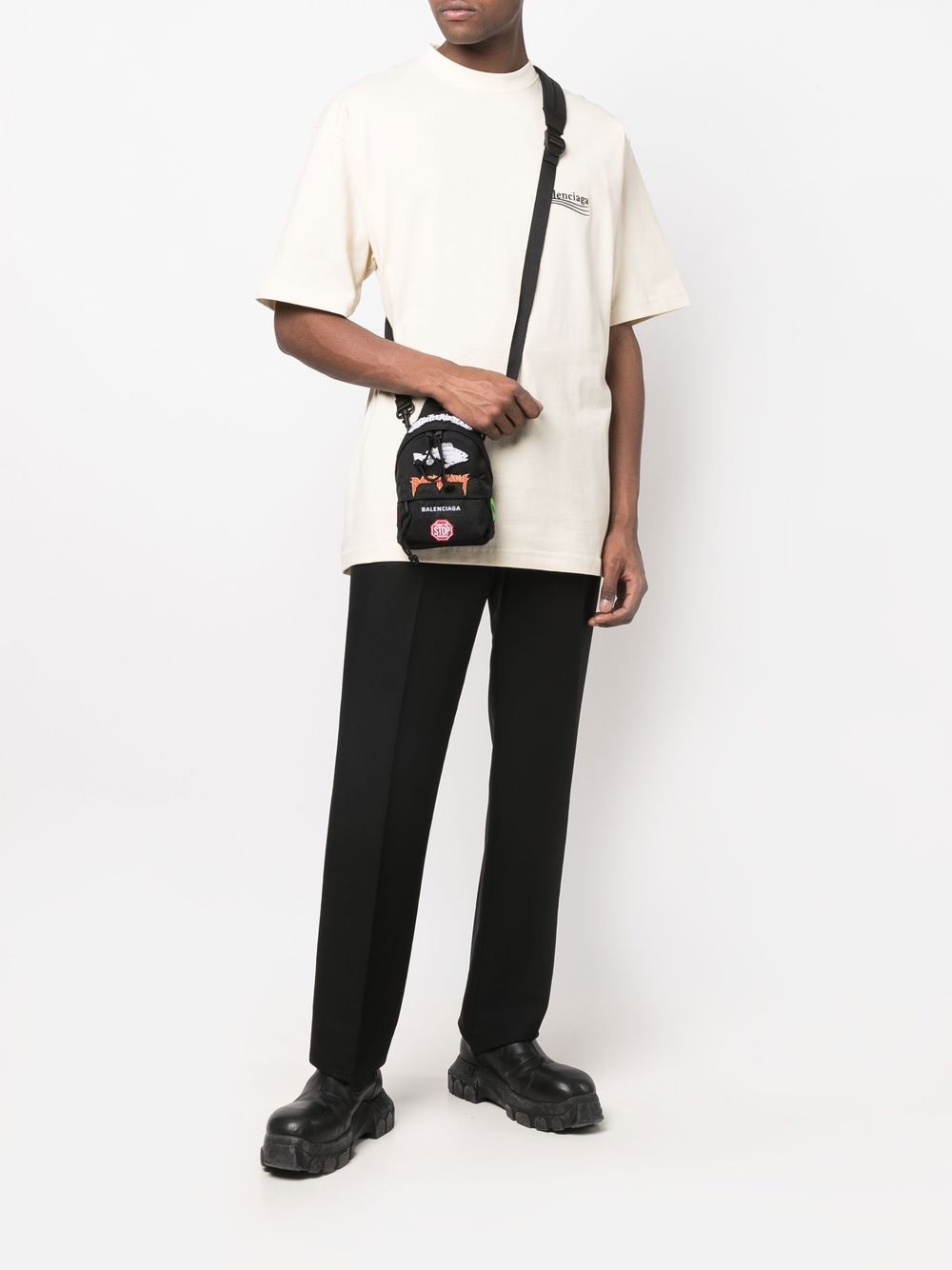 Jet black recycled polyamide patch-detail crossbody backpack from BALENCIAGA featuring logo patch to the front, adjustable detachable shoulder strap, top zip fastening, main compartment and front zip-fastening compartment. POSITIVELY CONSCIOUS: This Planet Conscious product is crafted from certified recycled or upcycled materials, which helps you make a better choice for the environment as they generate less energy, save water and reduce the need for new raw materials. For recycled synthetic clothing products we highly recommend using a microfibre-catching washing bag to ensure that no microplastics that can pollute water are released in the process..