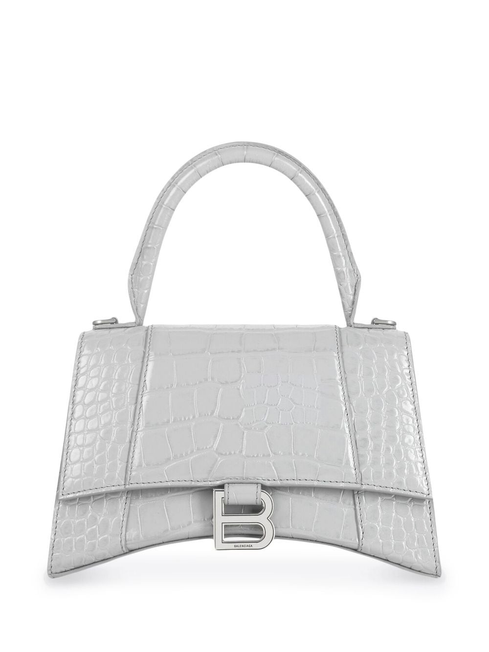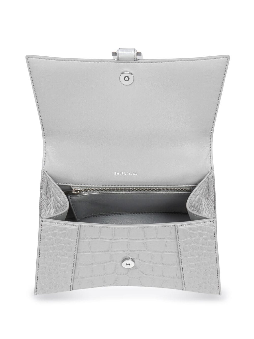 Inspired by outerwear silhouettes first introduced by founder Cristóbal Balenciaga, the Hourglass bag has become one of the brand’s most iconic shapes. It is re-invented for SS22 in a light grey iteration elevated with an embossed crocodile effect and can be worn across the body, on the shoulder or handheld thanks to its adjustable strap.