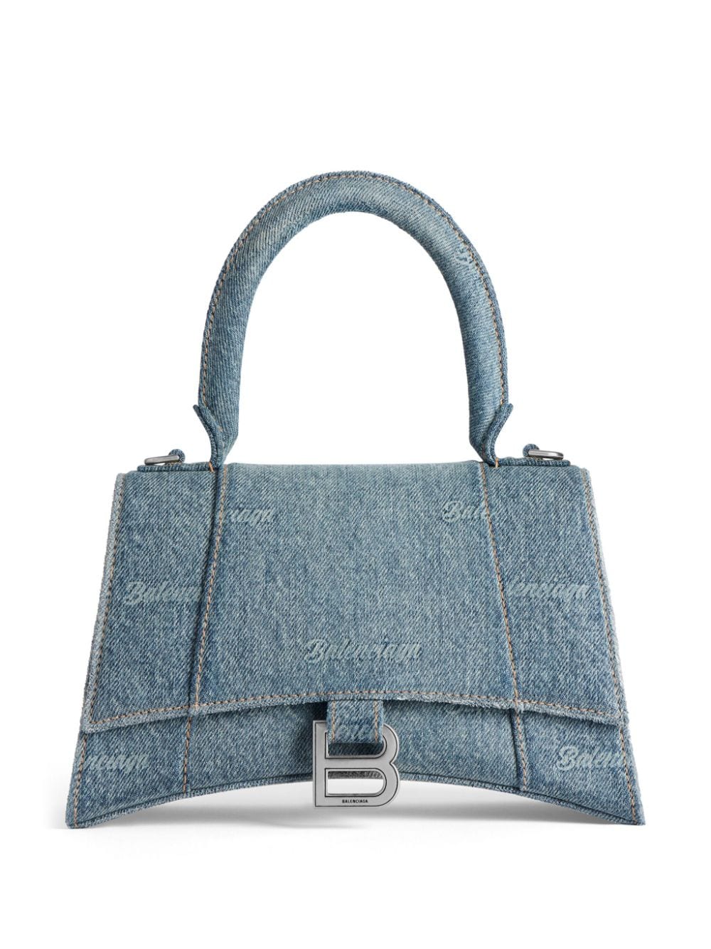 Launched in 2019, the Hourglass bag has since become a Balenciaga hallmark. This blue iteration is crafted from denim boasting an all-over logo jacquard and finished with a B logo charm to the front.