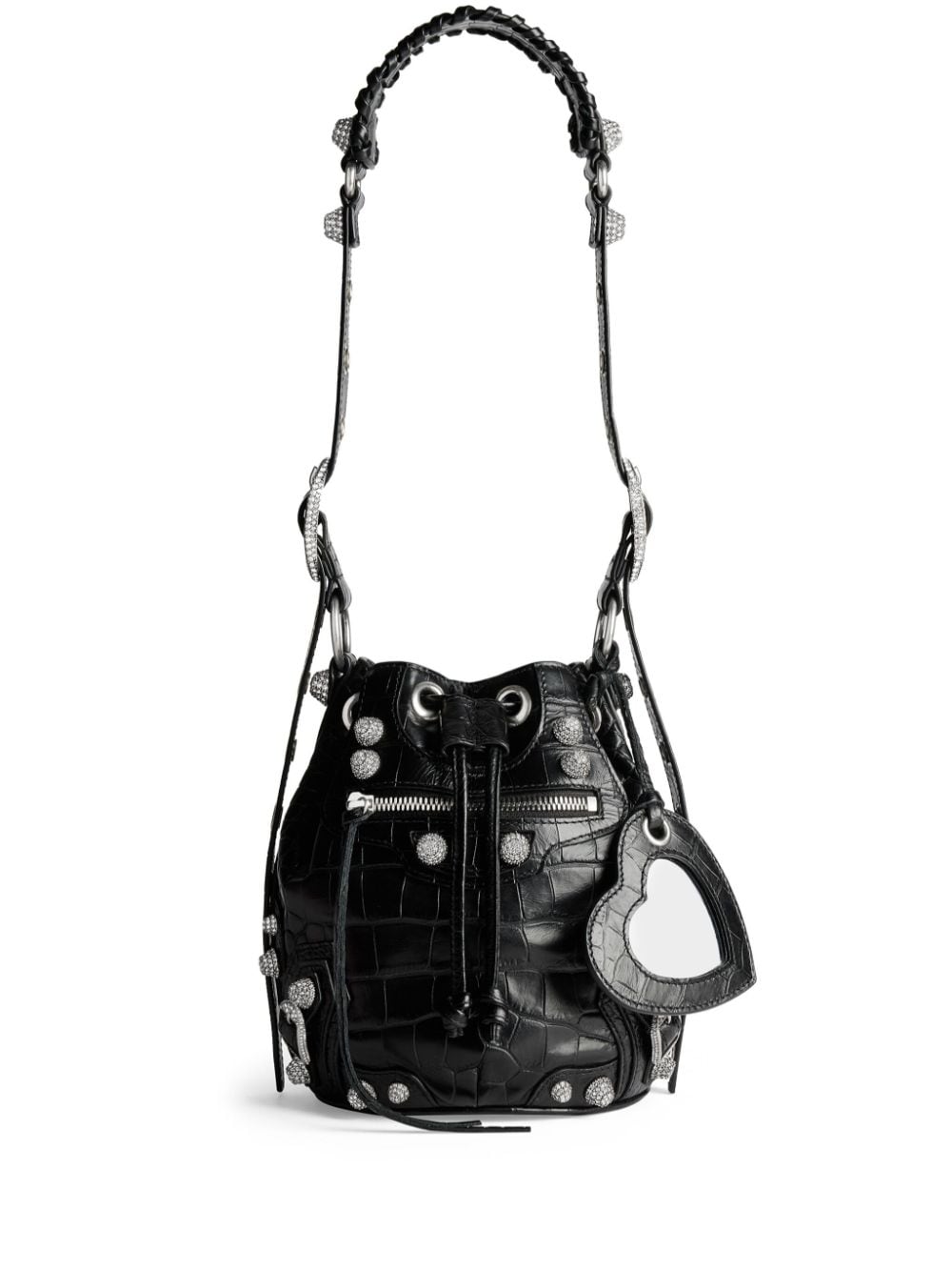 First appearing in Balenciaga’s pre-Fall 2021 show, Balenciaga presents its popular ‘Le Cagole’ bag in an XS size and black colourway for AW22. Crafted from calf leather, this compact accessory features elements from the brand’s iconic Neo Classic silhouette, including decorative buckles, flat studs and a whipstitch-detailed adjustable strap. The design includes the signature heart-shaped mirror and zipped cardholder synonymous with the style.