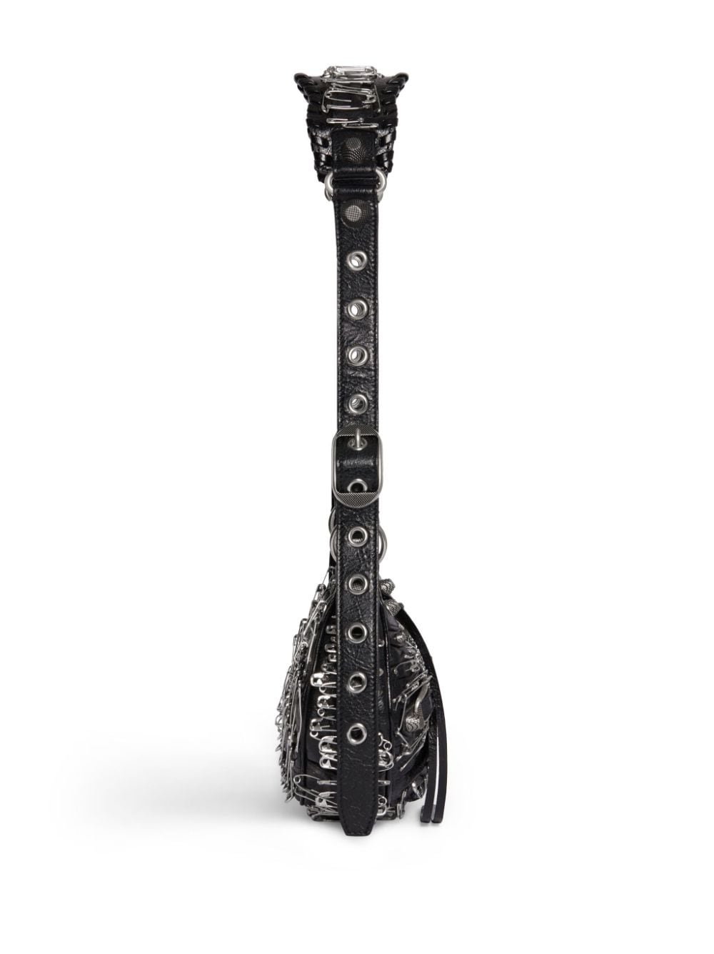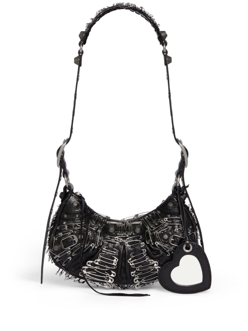 Balenciaga’s Le Cagole shoulder bag showcases the brand’s signature hardware. This black version is made from lambskin leather and adorned with paperclips throughout. The mirror compact is designed for touch-ups on the go.