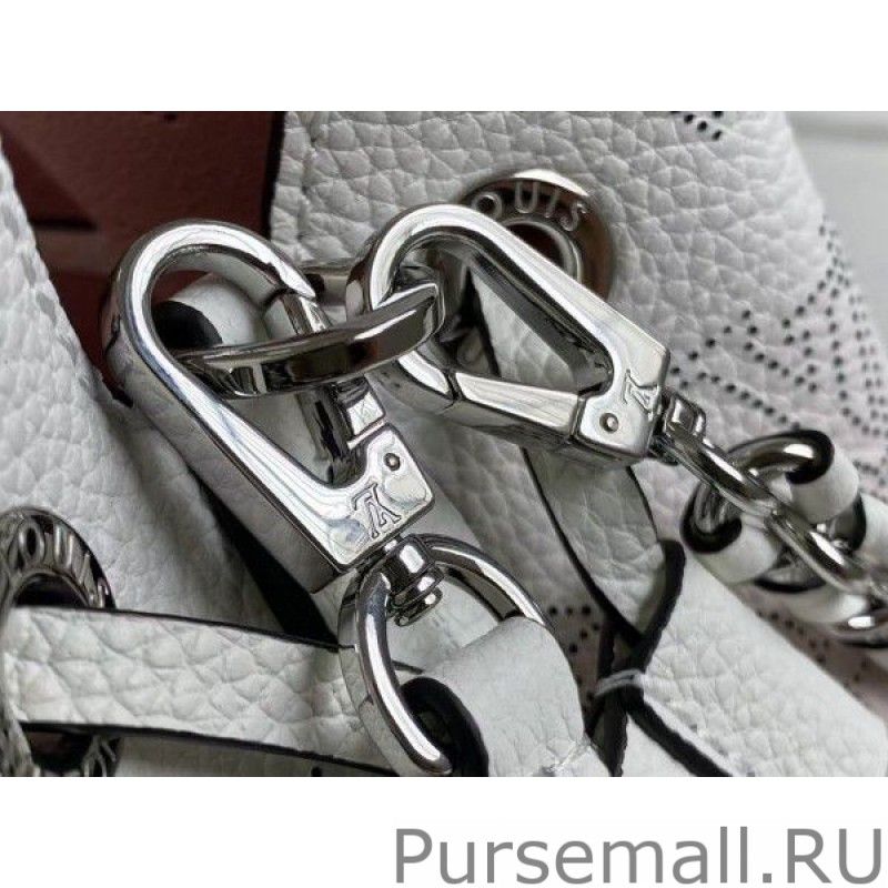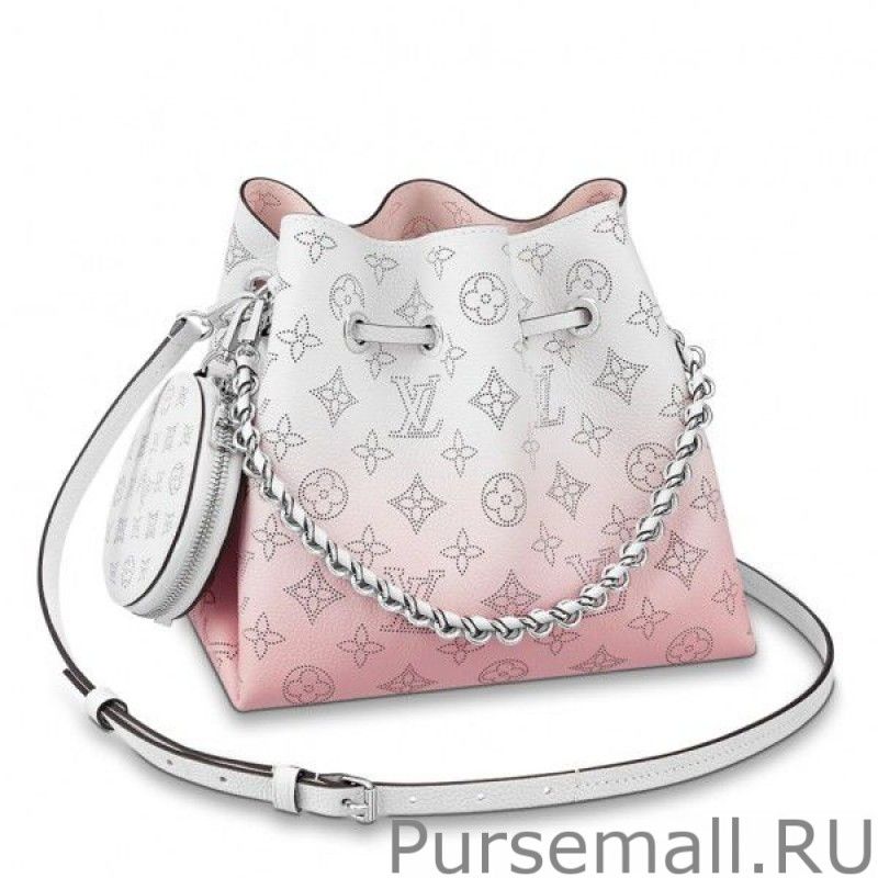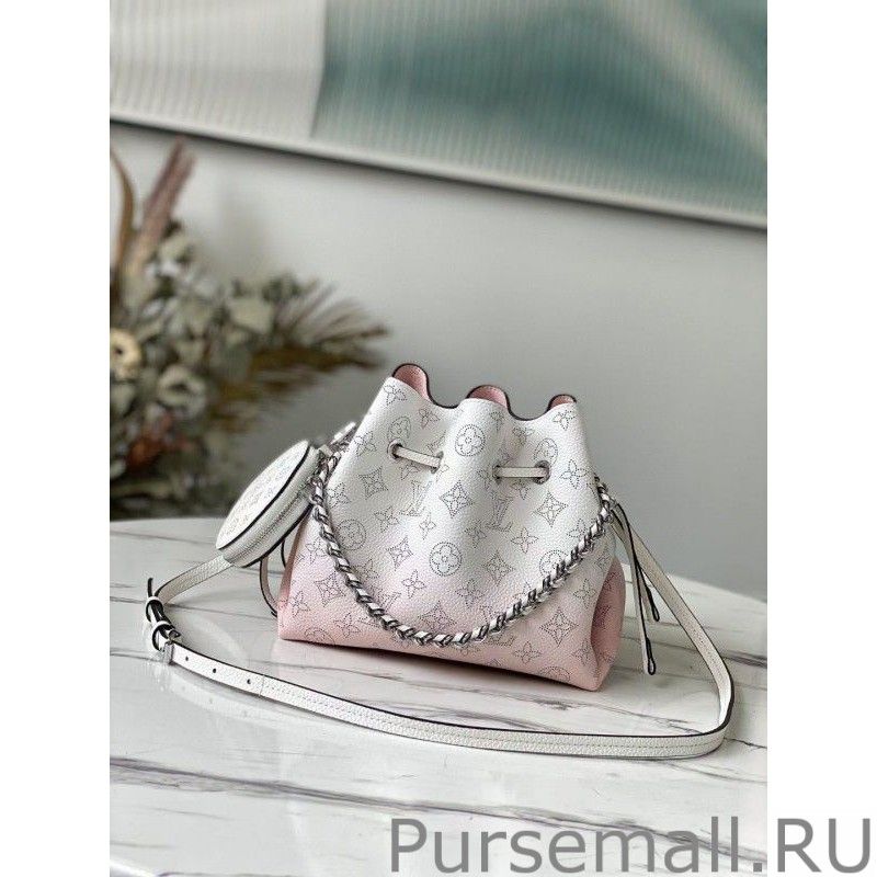 Fashioned from Mahina calf leather, the adorable Bella bucket bag includes a removable coin purse in matching Mahina leather. The gradient color of the leather goes from a deeper pastel tone to an almostwhite at top of the bag. The perforated Monogram pattern in the Mahina leather and the color treatment give it a summery feel.
