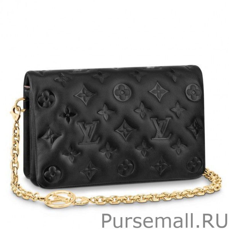 The Pochette Coussin is crafted from soft lambskin, which is embossed with the Monogram pattern to create a puffy, cushiony effect. This is further enhanced by the construction of the pouch, which gives it a supple, bodyfriendly shape. The removable chain, decorated with a charm, offers different carry options: clutch, shoulder or belt.