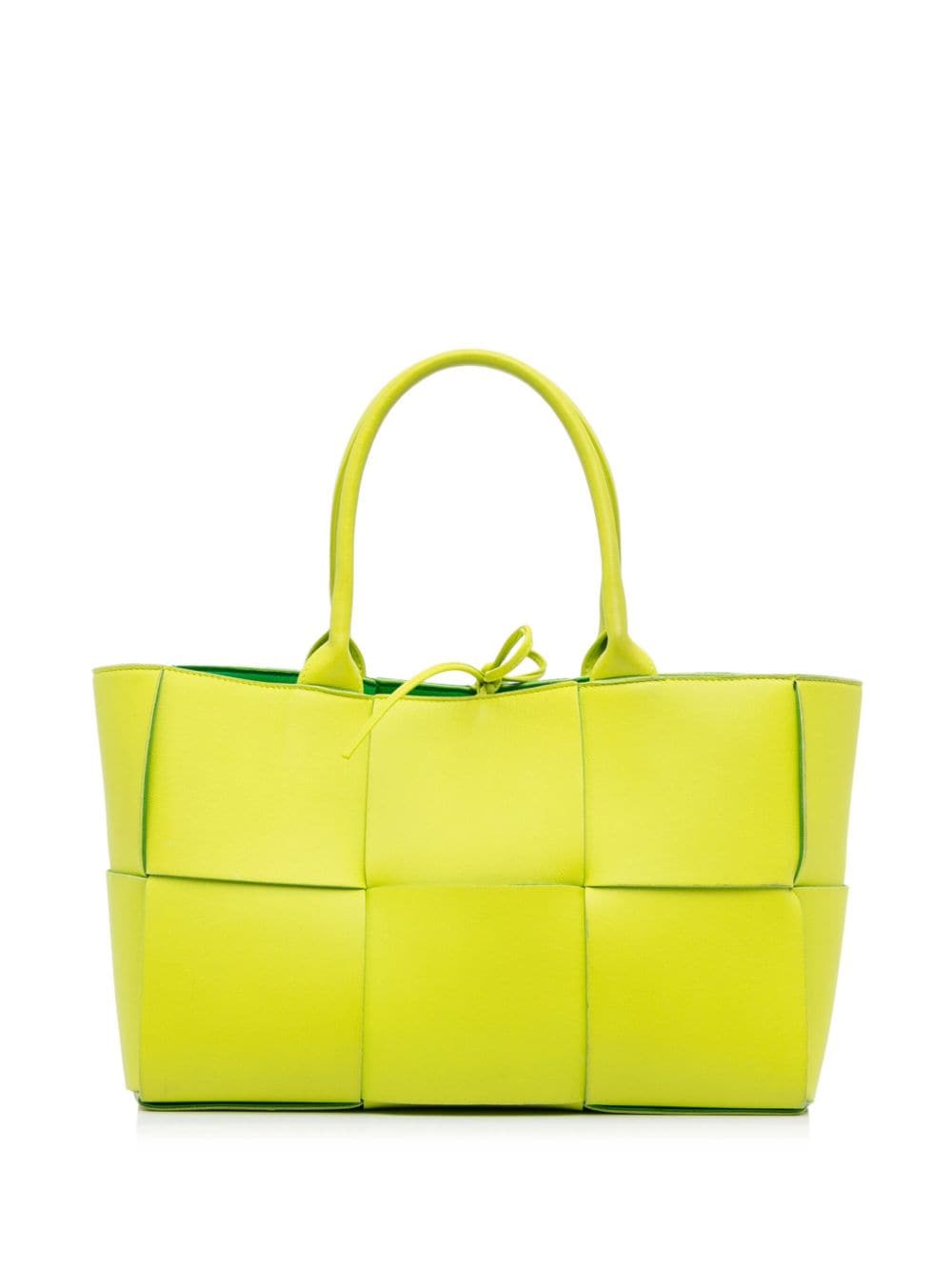 Created in the late ’60s, the Intrecciato — a weaving technique — became Bottega Veneta’s most distinguished design element. It’s seen on this small Arco tote bag, in a Maxi iteration, which is rendered in lime-green calf leather for a statement, zingy look.