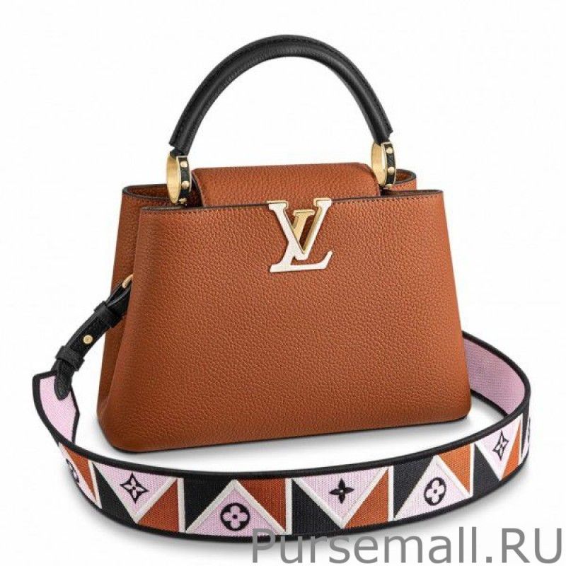 This Capucines BB handbag is made from Taurillon leather and features a wide colorful strap, with embroidered on one side and a graphic design of triangles and Monogram Flowers on the other. Named after a mountain range, the Karakoram pattern takes several hours to be embroidered on each strap.