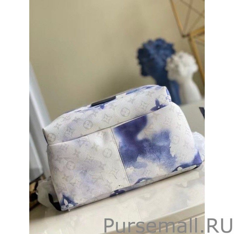 The Discovery Backpack is made from white canvas with Monogram Flowers and LVs in dreamy blue watercolor. Inspired by the classic university backpack, this versatile bag features three inside pockets, including one for an iPad. Two adjustable leather shoulder straps assure carrying comfort.