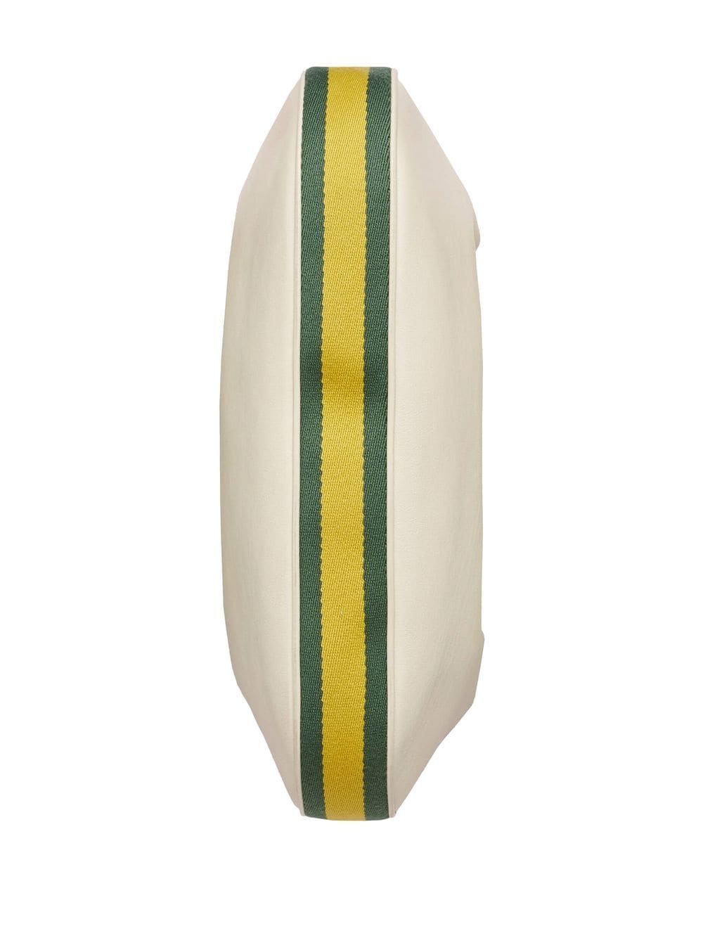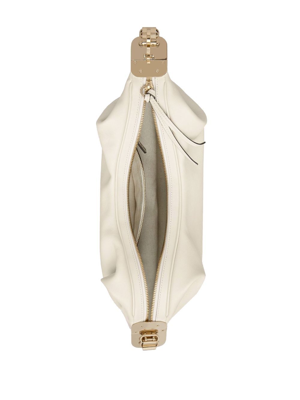Beige, chiusura superiore con zip, placca con logo, design con fascia singola, scomparto unico e dettagli color oro.