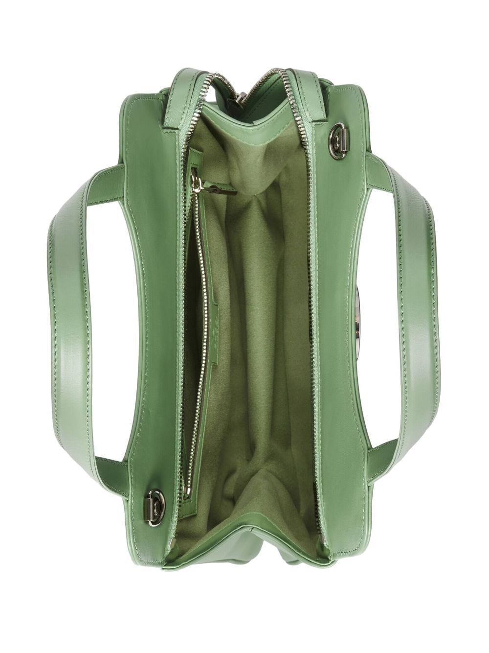 Verde salvia, pelle, caratteristico logo Doppia G, dettagli color palladio, chiusura superiore con zip, tracolla rimovibile, due manici piatti, scomparto unico, tasca interna con zip e fodera in pelle scamosciata.