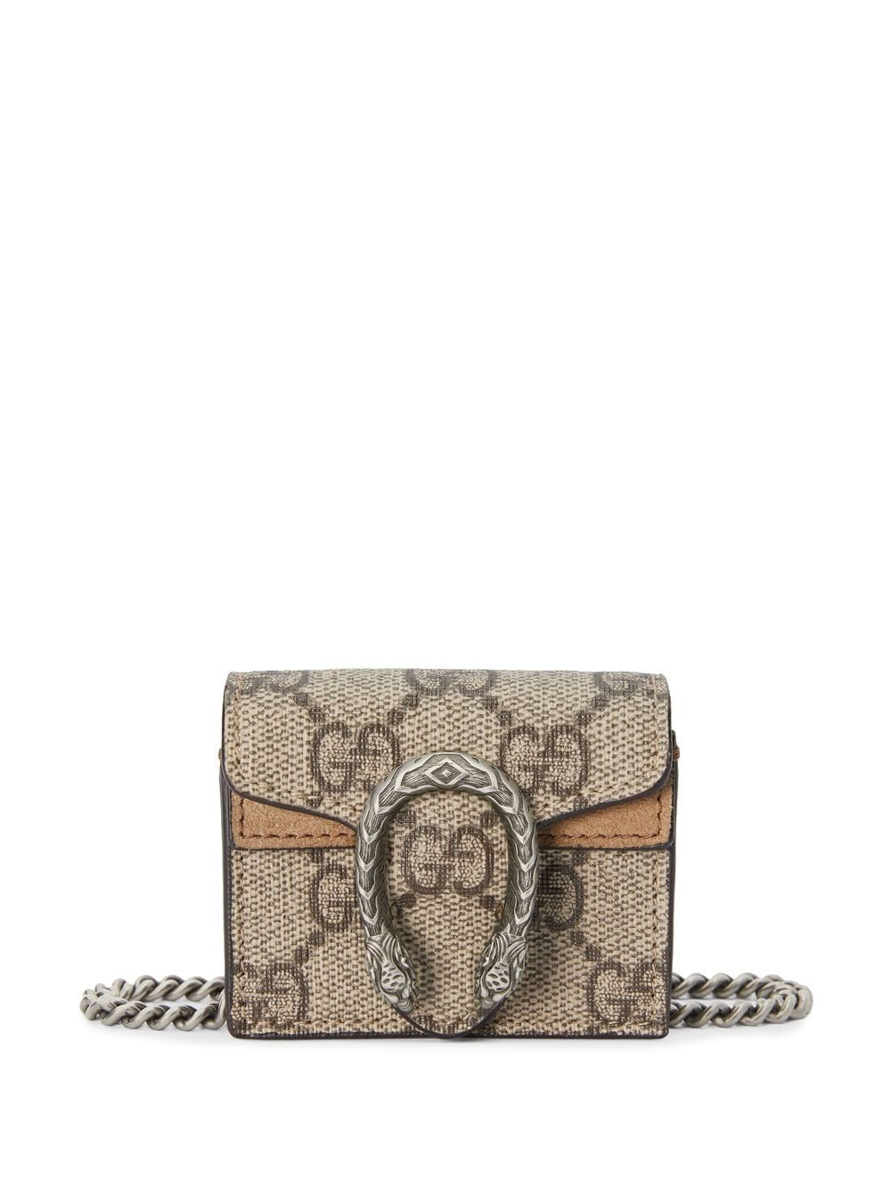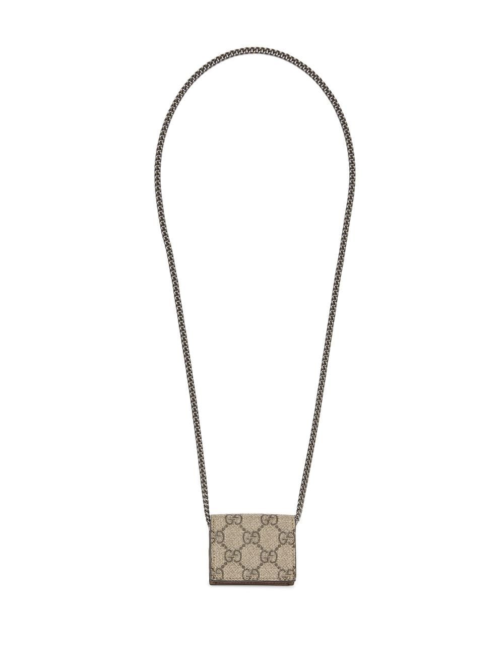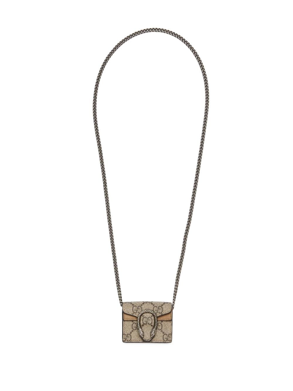 Dionysus AirPod case from GUCCI featuring beige, canvas, leather, palladium-tone hardware, classic GG canvas, moire effect, foldover top with magnetic fastening, main compartment and chain-link shoulder strap.