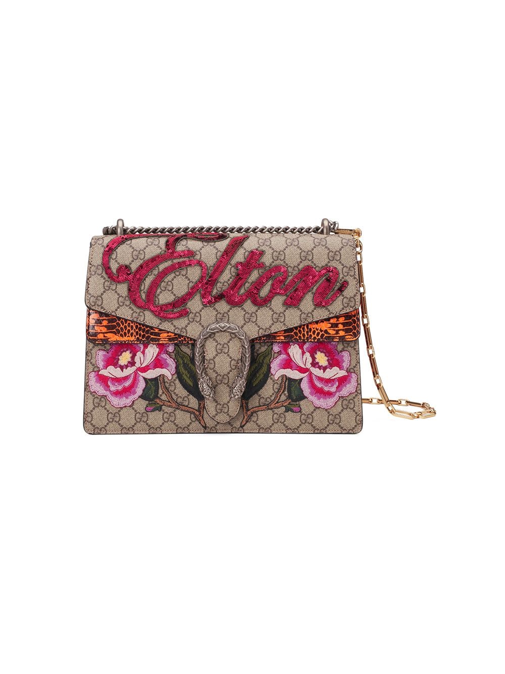 The Dionysus shoulder bag with the now defining textured tiger head closure. A tribute sequin “Elton” embroidery contrasted by floral appliqués. The layers of appliqués over the GG pattern is an essential part of Alessandro Michele’s designs. Please note that this item cannot be shipped outside the E.U..