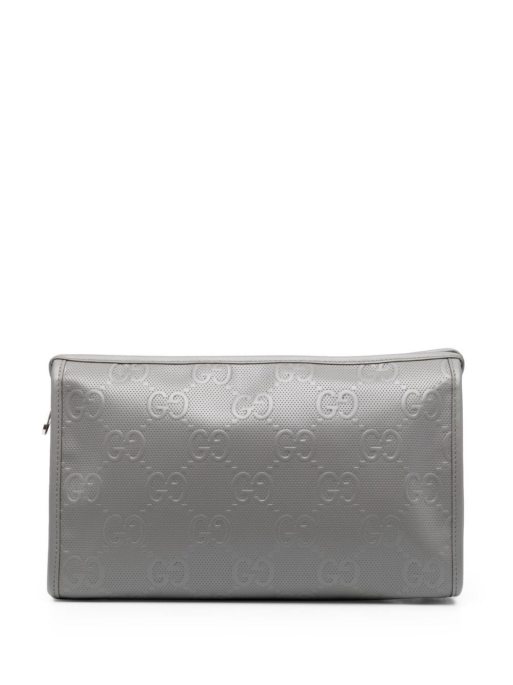 GG monogram-embossed clutch bag from GUCCI featuring ash grey, calf leather, signature Double G logo, embossed monogram pattern, top zip fastening, main compartment, internal logo stamp and internal zip-fastening pocket.