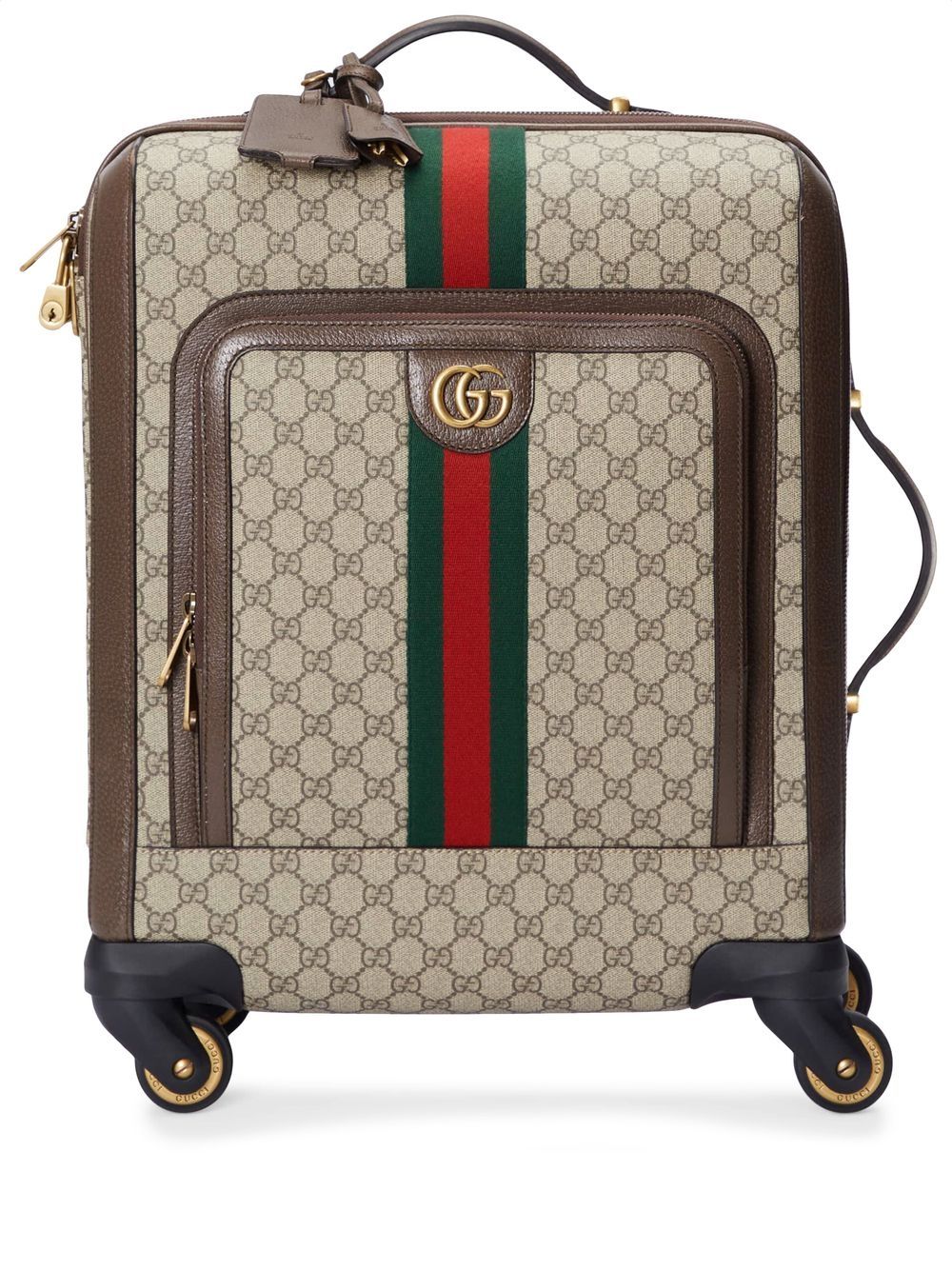From the Gucci Love Parade collection, this suitcase showcases the house’s signature GG Supreme canvas. This detailing is accompanied by other key house codes including a Double G motif and signature Web stripe, creating a branding-focused finish for the piece.