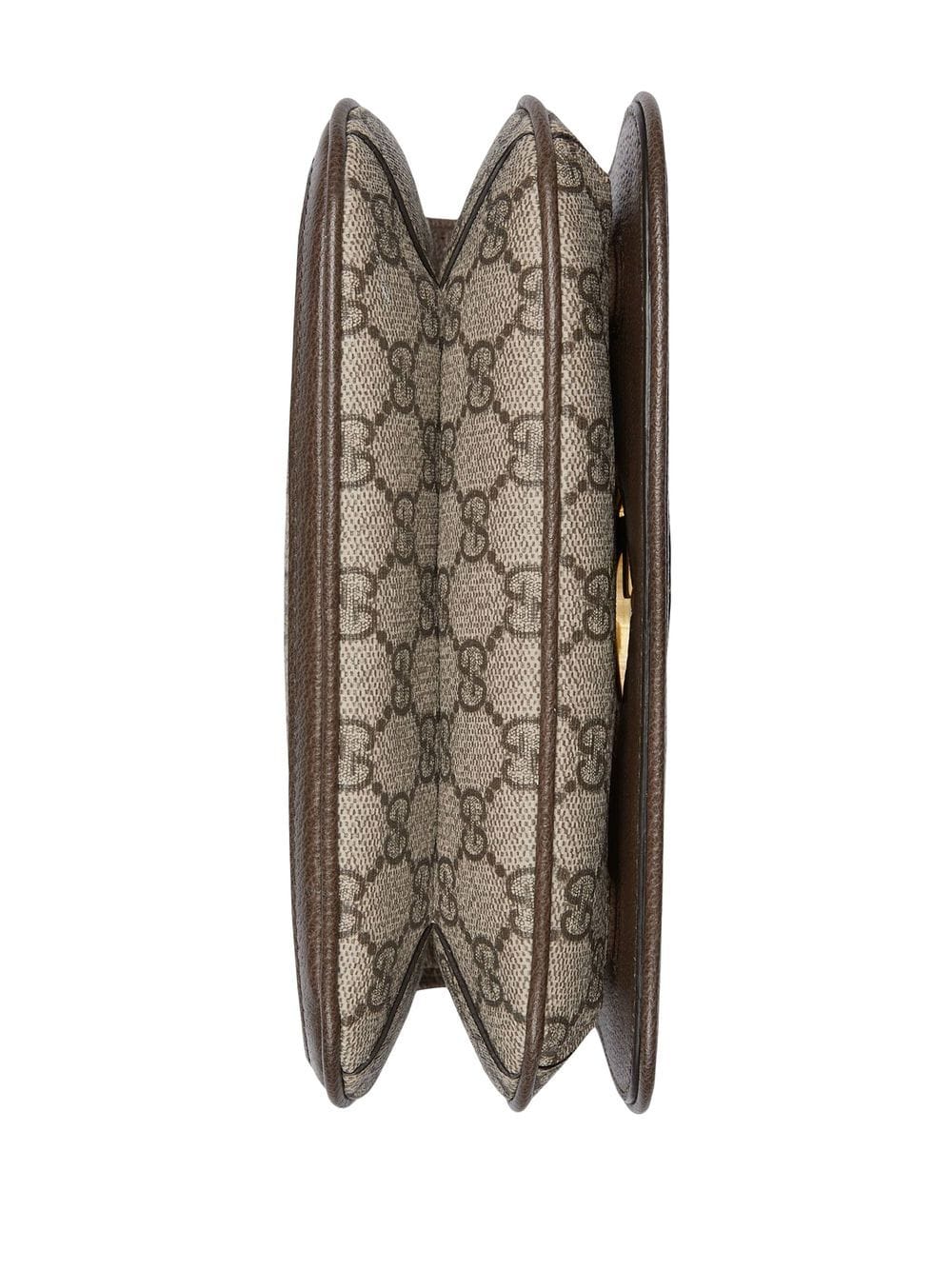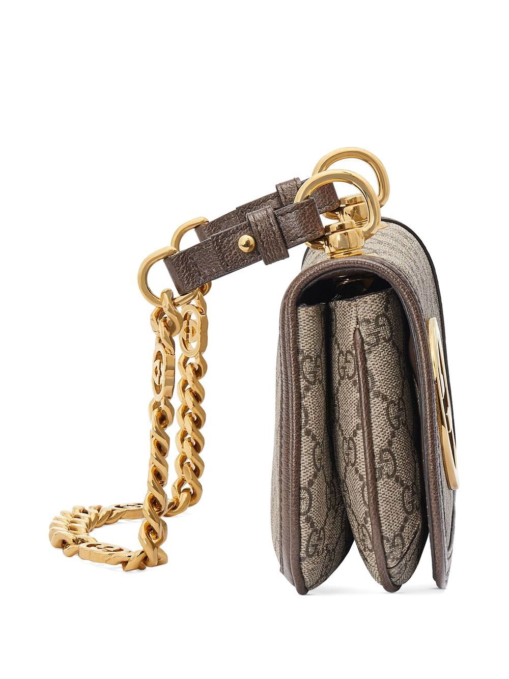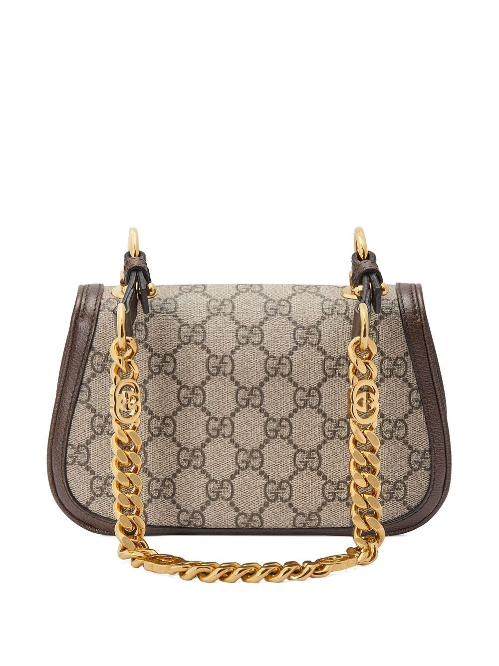 Gucci Blondie mini shoulder bag from Gucci featuring beige, brown, classic GG canvas, leather trim, signature Interlocking G logo plaque, chain-link shoulder strap, interchangeable strap, foldover top with magnetic fastening and partitioned compartment.
