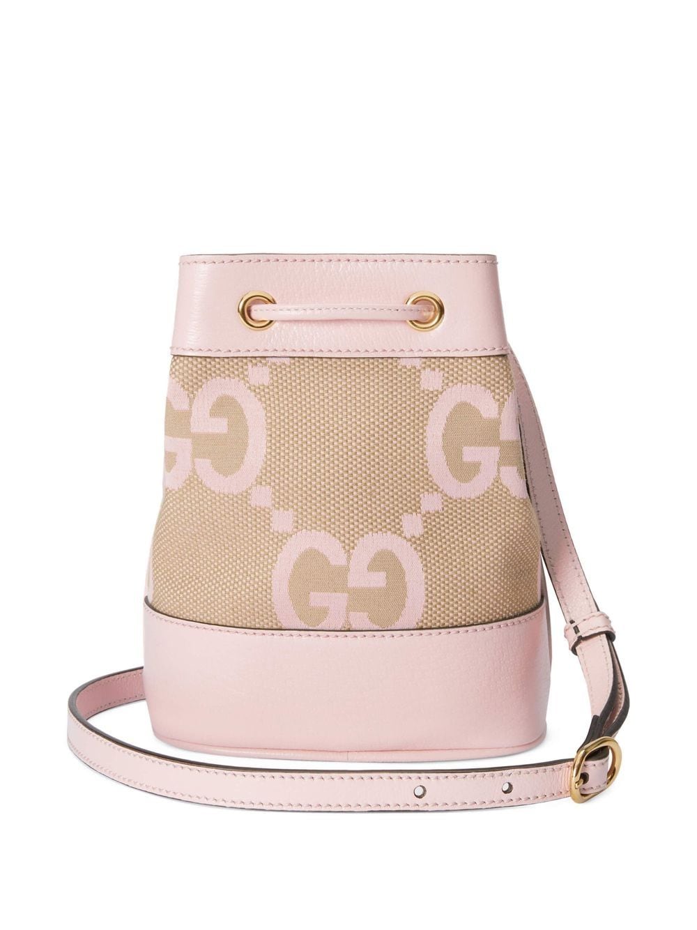 Ophidia Jumbo GG bucket bag from Gucci featuring light pink, beige, leather, Jumbo GG canvas, tassel detail, drawstring fastening, adjustable shoulder strap, gold-tone hardware and main compartment.