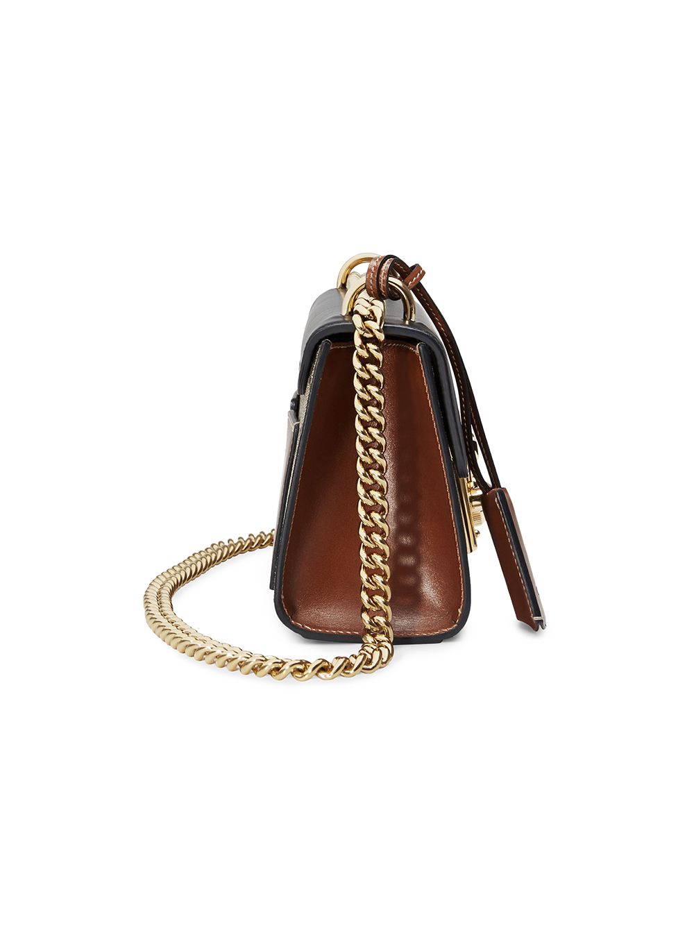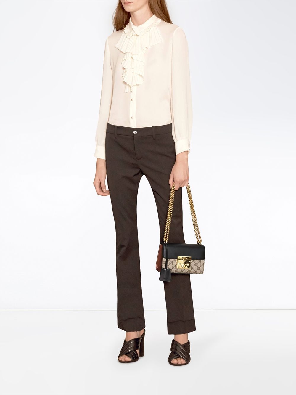 A small structured GG Supreme canvas bag with a leather top and our key lock closure. The sliding chain strap can be worn multiple ways, changing between a shoulder and a top handle bag. Beige/ebony GG Supreme canvas, a material with low environmental impact. Black leather top and brown leather key holder. Gold toned hardware. Key with leather holder. Interior open pocket. Exterior pocket. Sliding chain strap can be worn as a shoulder strap with 51cm drop or can be worn as a top handle with 28cm drop. Lock closure. Small size: W20.5cm x H13cm x D7.5cm. Camel microfiber lining with a suede-like finish. Made in Italy.