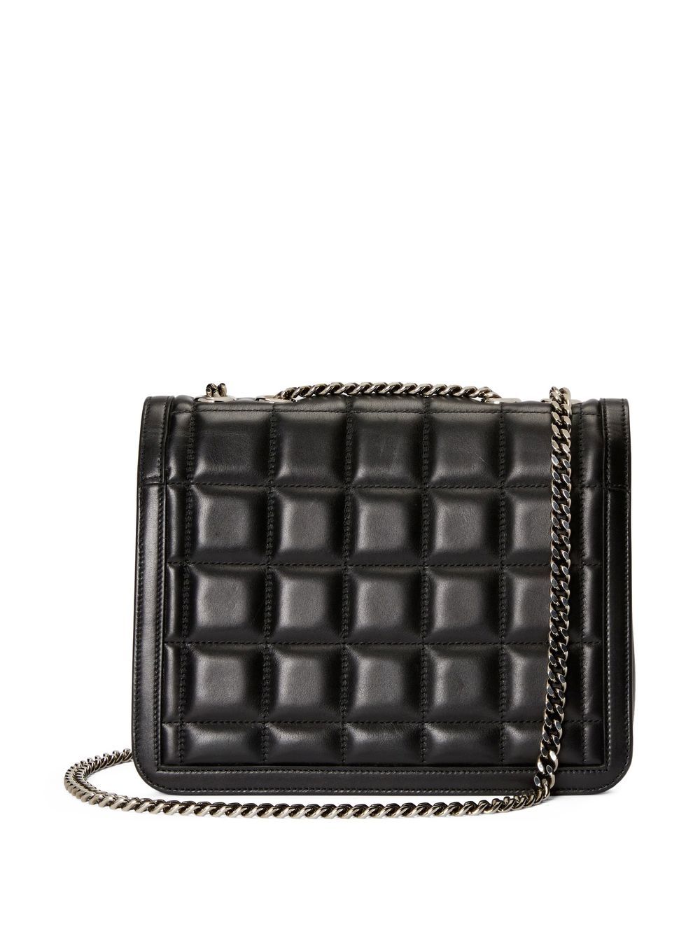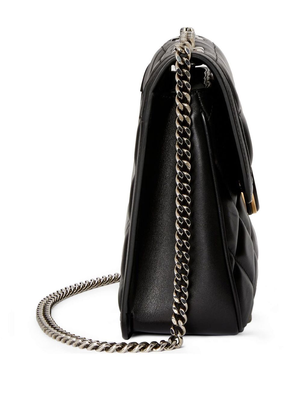 quilted shoulder bag from Gucci featuring black, leather, quilted, gold-tone logo plaque, foldover top with magnetic fastening, top zip fastening, internal zip-fastening pocket and chain-link shoulder strap.