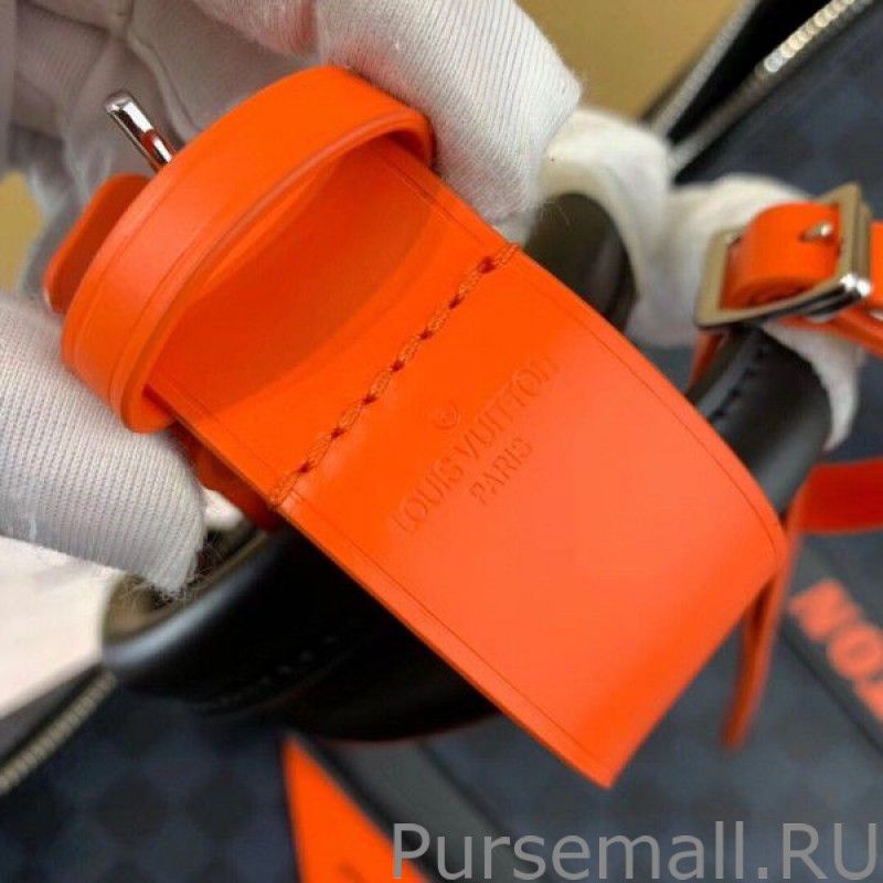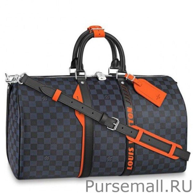 classic Keepall bag has never looked sportier. The rich, deep colors of Damier Cobalt canvas are enlivened with bright orange accents: a logo inspired by the Spring-Summer 2019 show, speed linee laser cuts to evoke the excitement of auto racing,Plus a shoulder strap and large capacity to make this a practical carry-on bag.