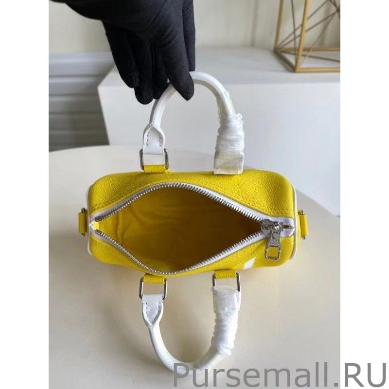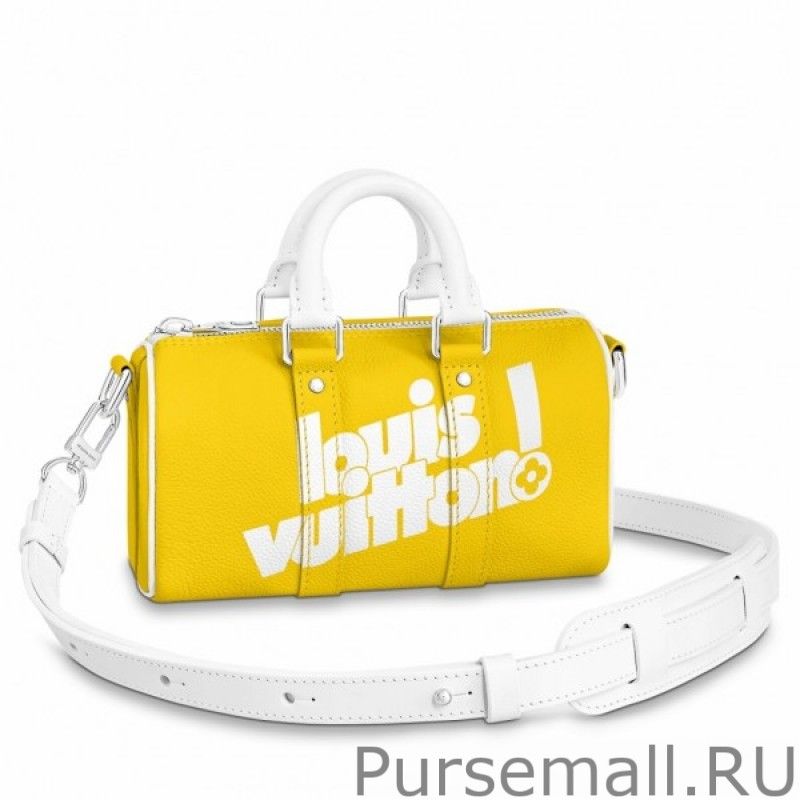 The fashionably small Keepall XS bag for men is a compact version of the House’s iconic Keepall weekend bag from the 1930s. Here Virgil Abloh crafts it from bright yellow leather and signs it with his new “louis vuitton!” graphic. It has two top handles and an adjustable strap for hand or shoulder carry.