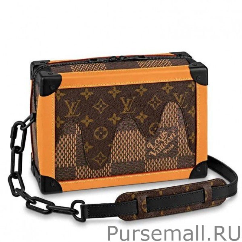 Virgil Abloh and Japanese streetwear designer Nigo have come together to refresh the Soft Trunk messenger bag in Giant Damier Ebene canvas and natural leather. The Soft Trunk leather corners, padlock and Slock make reference the House trunk making roots while the drippy wave motif in Monogram canvas on the front evokes Nigo streetwear work.