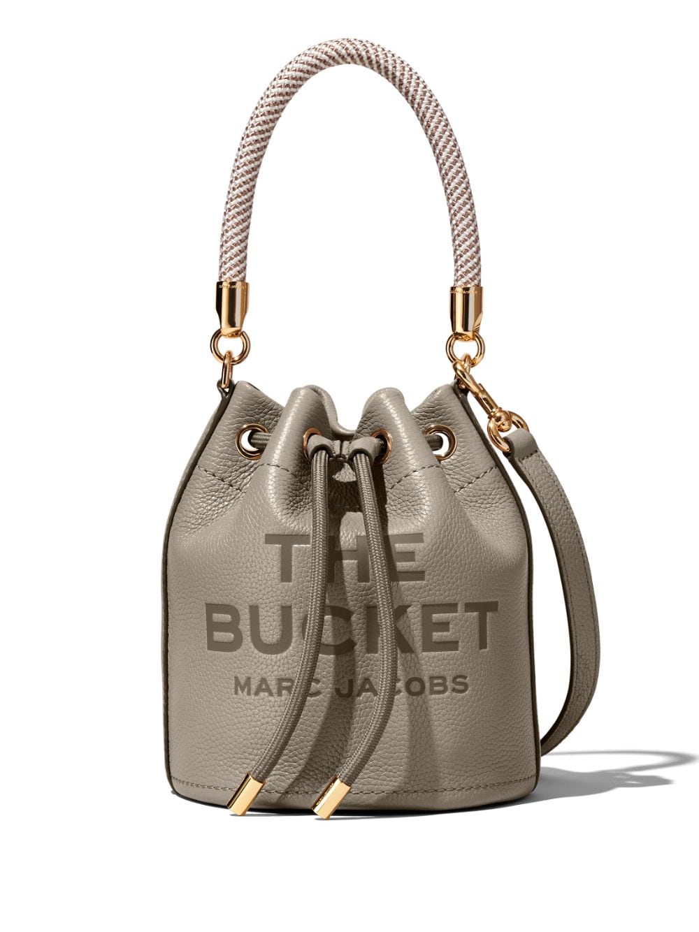 debossed-logo leather bucket bag from Marc Jacobs featuring brown, calf leather, grained texture, debossed logo to the front, logo patch to the rear, gold-tone hardware, drawstring fastening, adjustable detachable shoulder strap, single rounded top handle, main compartment and internal logo patch.